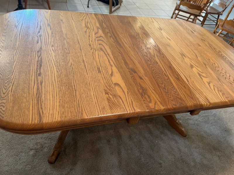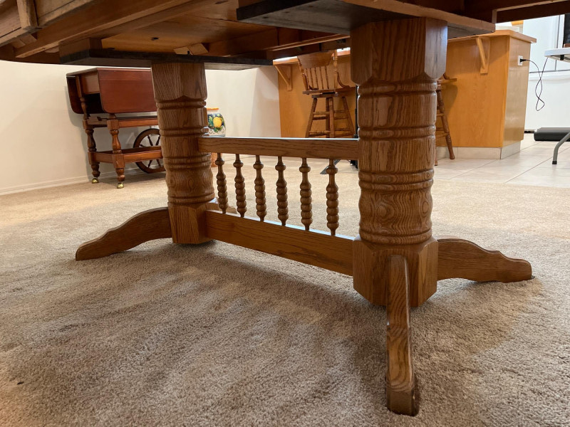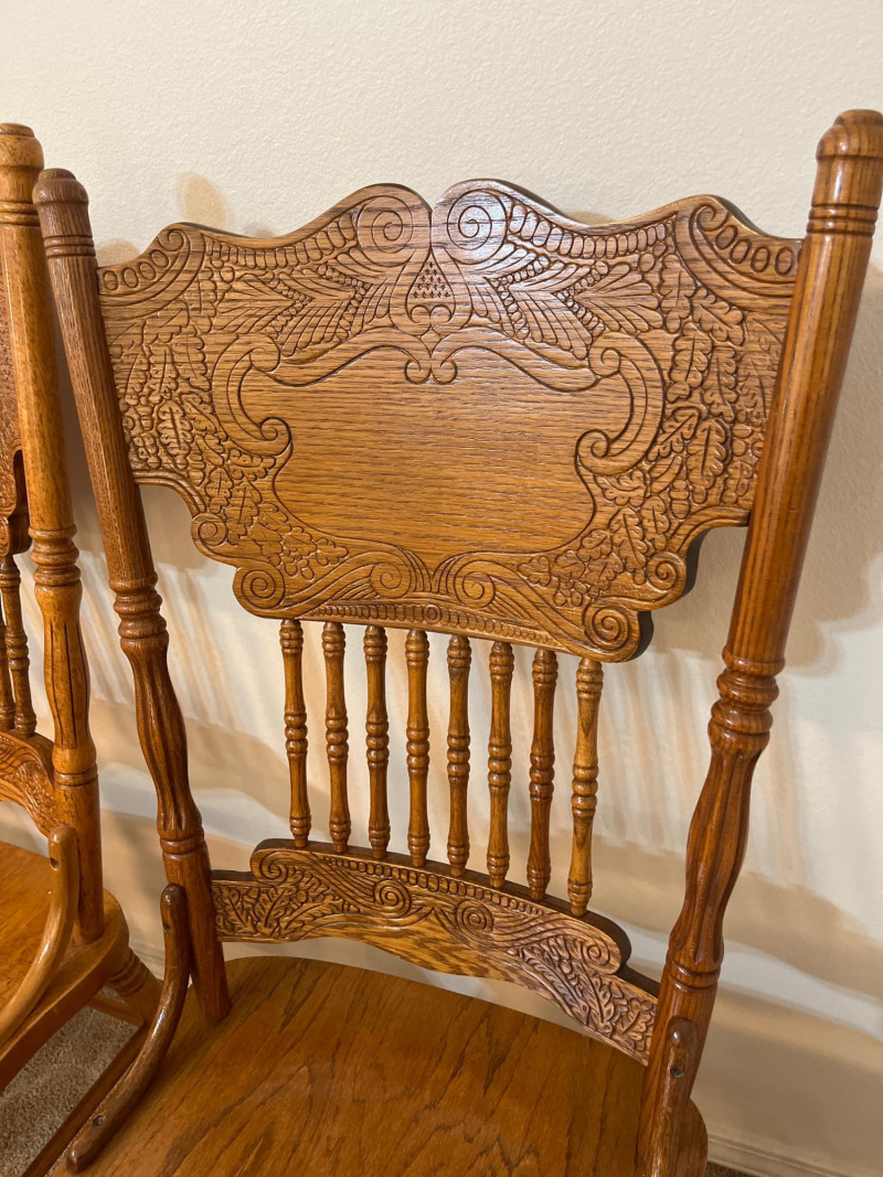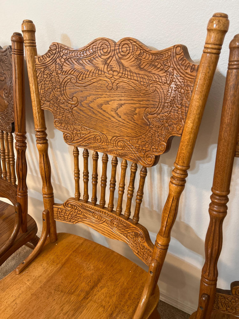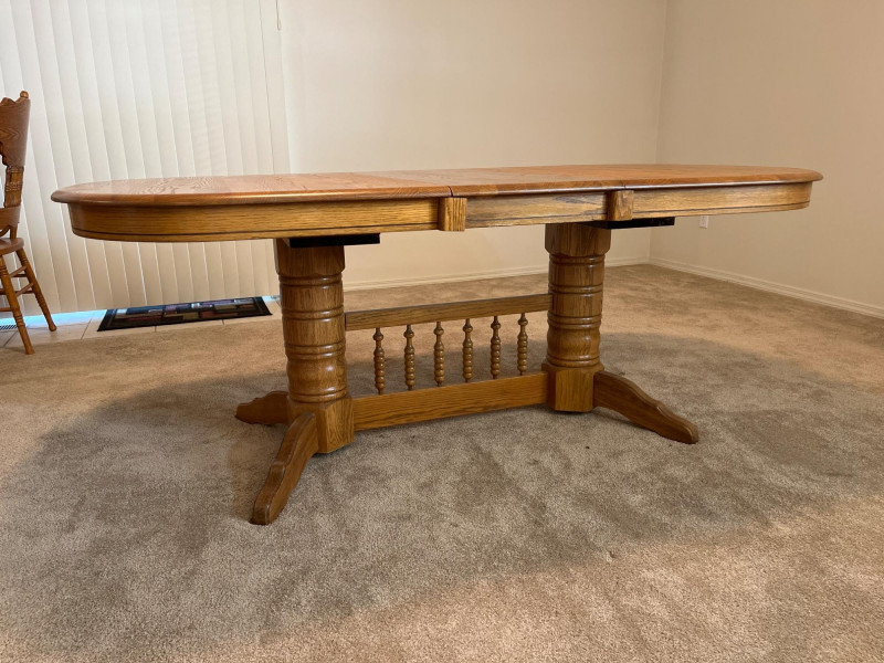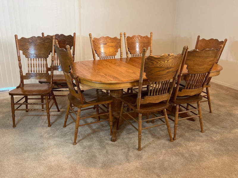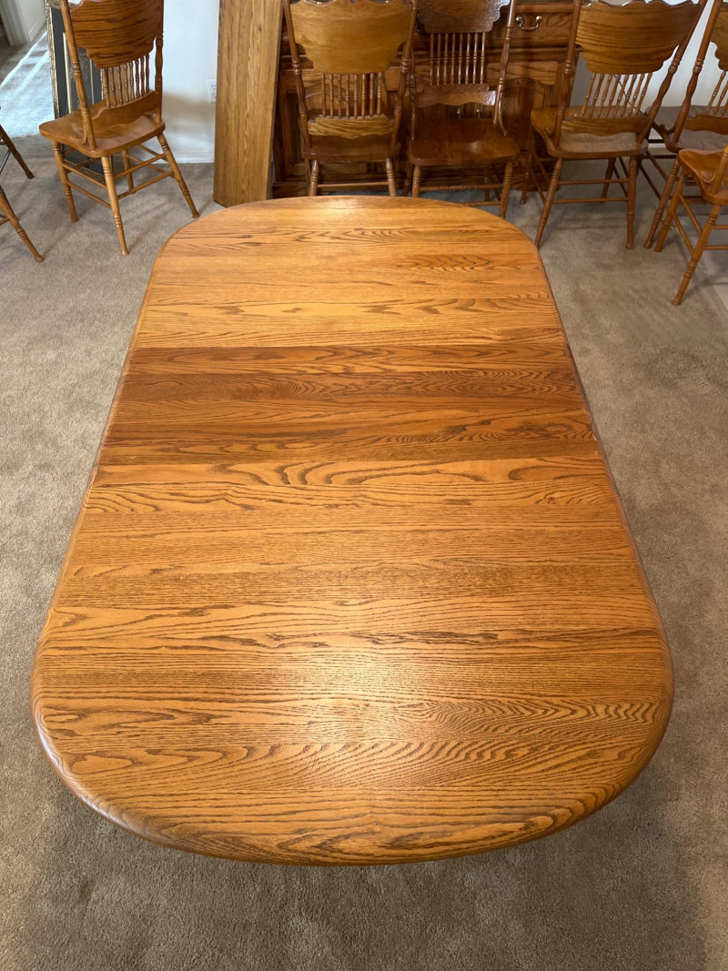 Amish Apple Grove Pressback Style Oak Table with 8 Chairs This traditional style is a popular choice for farmhouse, cottagecore, and rustic aesthetics that are incredibly popular. You can't find a more durable yet elegant style that will last generations! Table with no leaves is 42" wide and 60" long. Each leaf is 14 1/2" wide. The table is shown here with one leaf installed. Every piece is in good condition with minimal wear.
