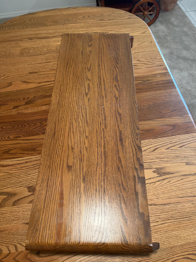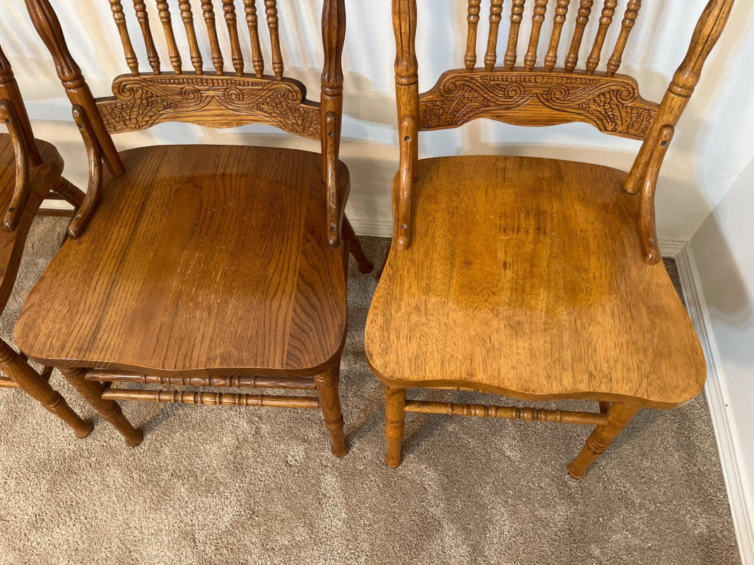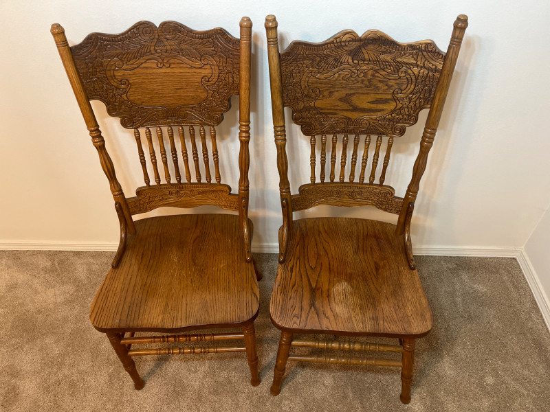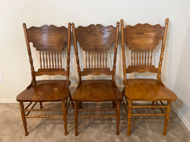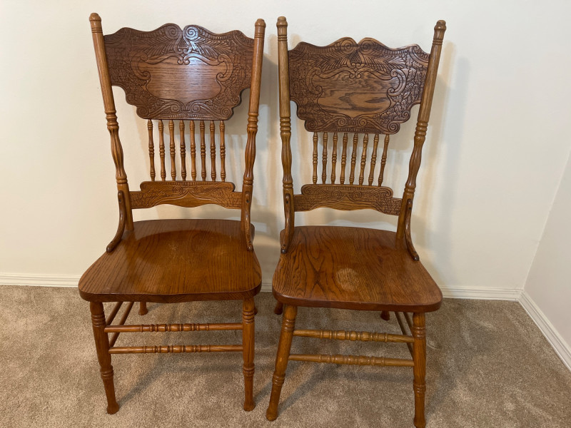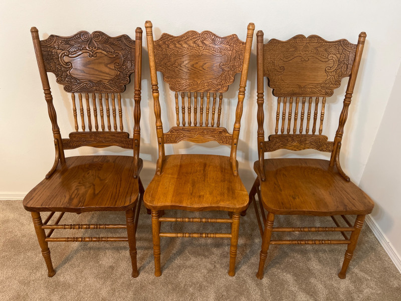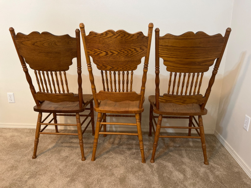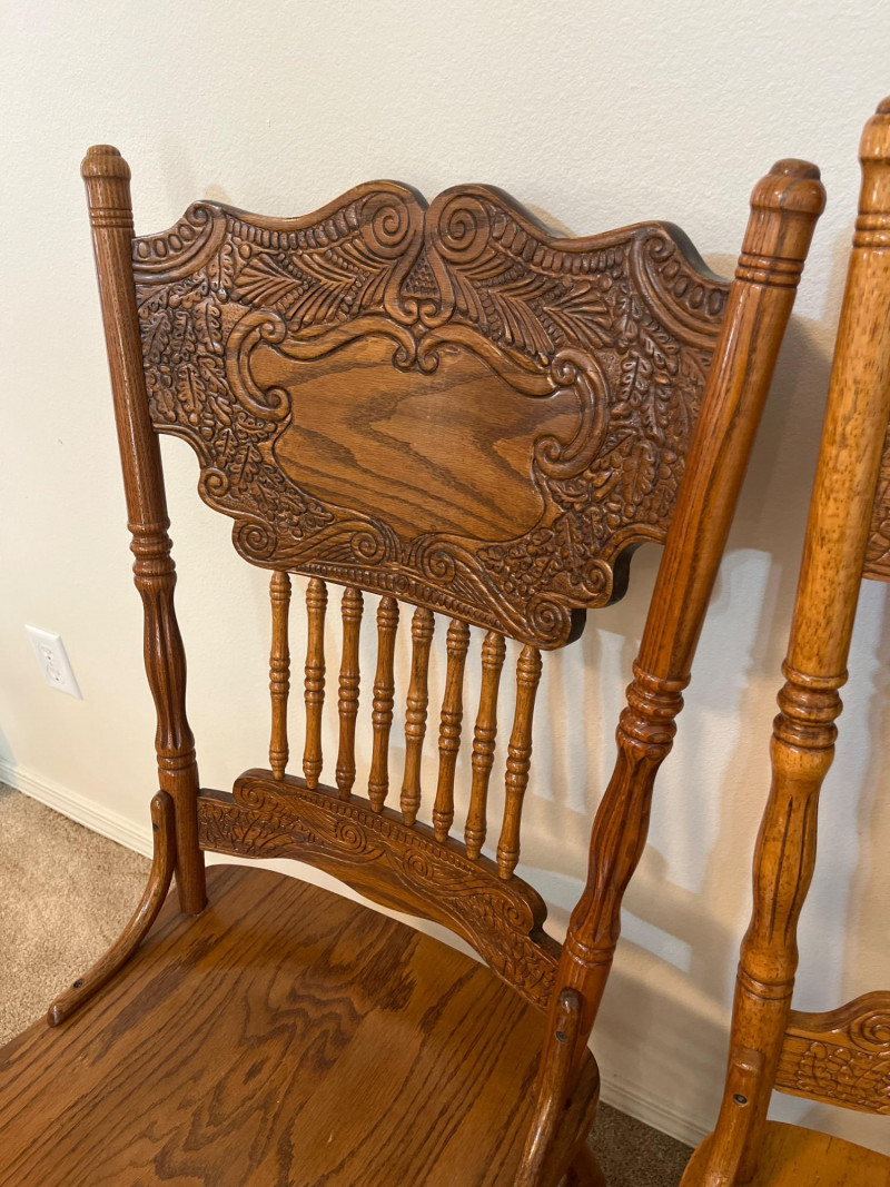 Amish Apple Grove Pressback Style Oak Table with 8 Chairs This traditional style is a popular choice for farmhouse, cottagecore, and rustic aesthetics that are incredibly popular. You can't find a more durable yet elegant style that will last generations! Table with no leaves is 42" wide and 60" long. Each leaf is 14 1/2" wide. The table is shown here with one leaf installed. Every piece is in good condition with minimal wear.