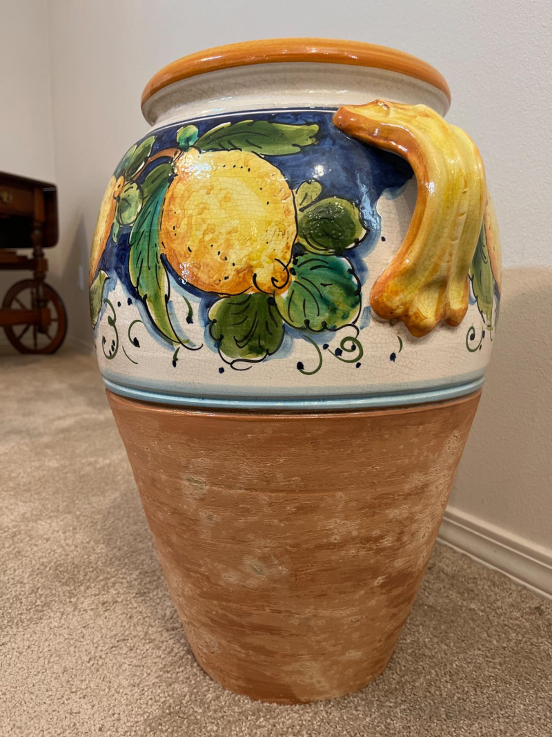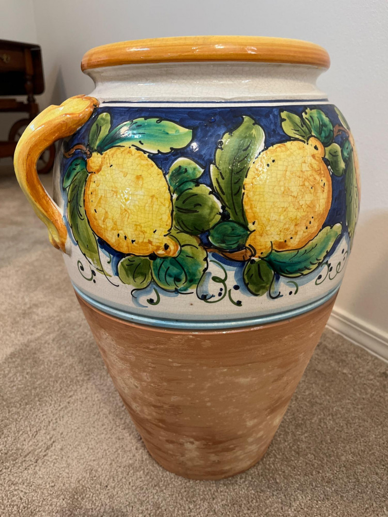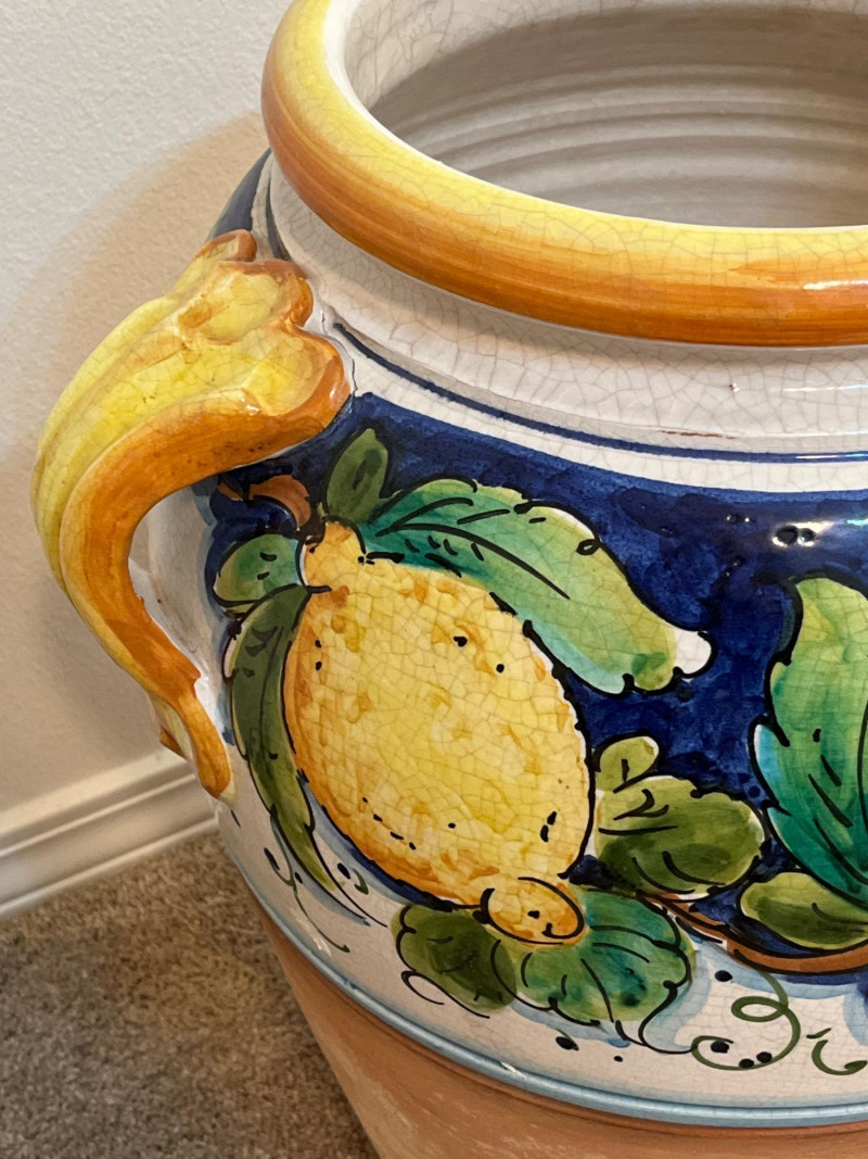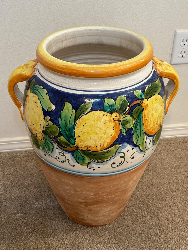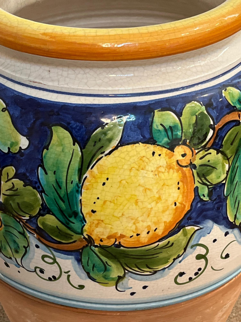 Large Italian Ceramic Lemon Themed Vase or Umbrella Stand Stands 19 1/2" tall and is very heavy. Stamped on the bottom, "Handpainted in Italy". The finish over the lemon painted portion has a crackle effect adding to its rustic charm. The bottom terra cotta portion is unglazed but smooth. The inside and underside are glazed and shiny.