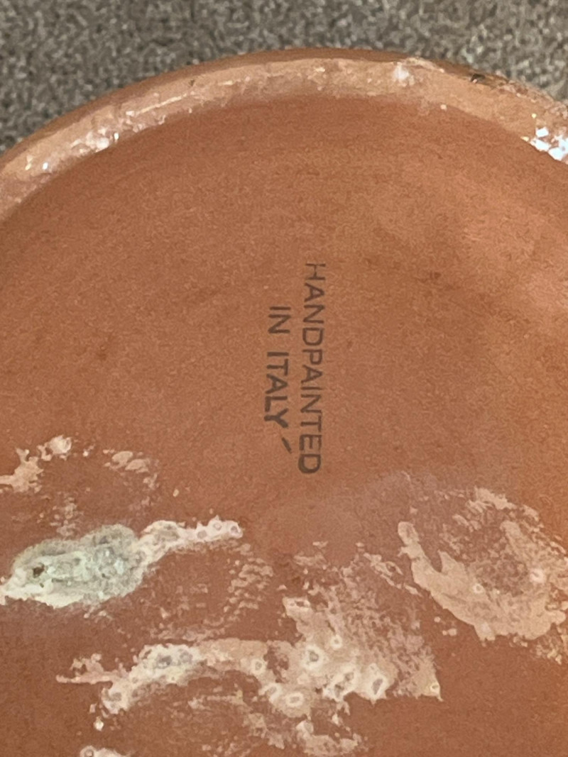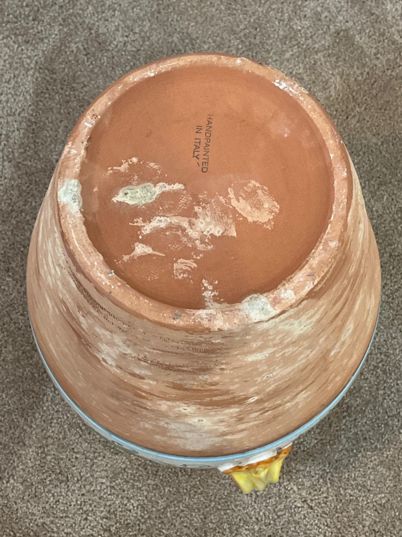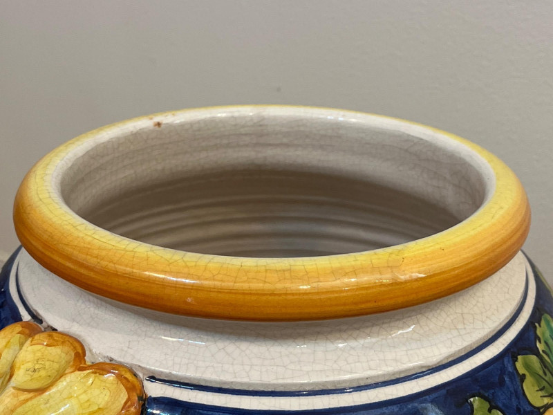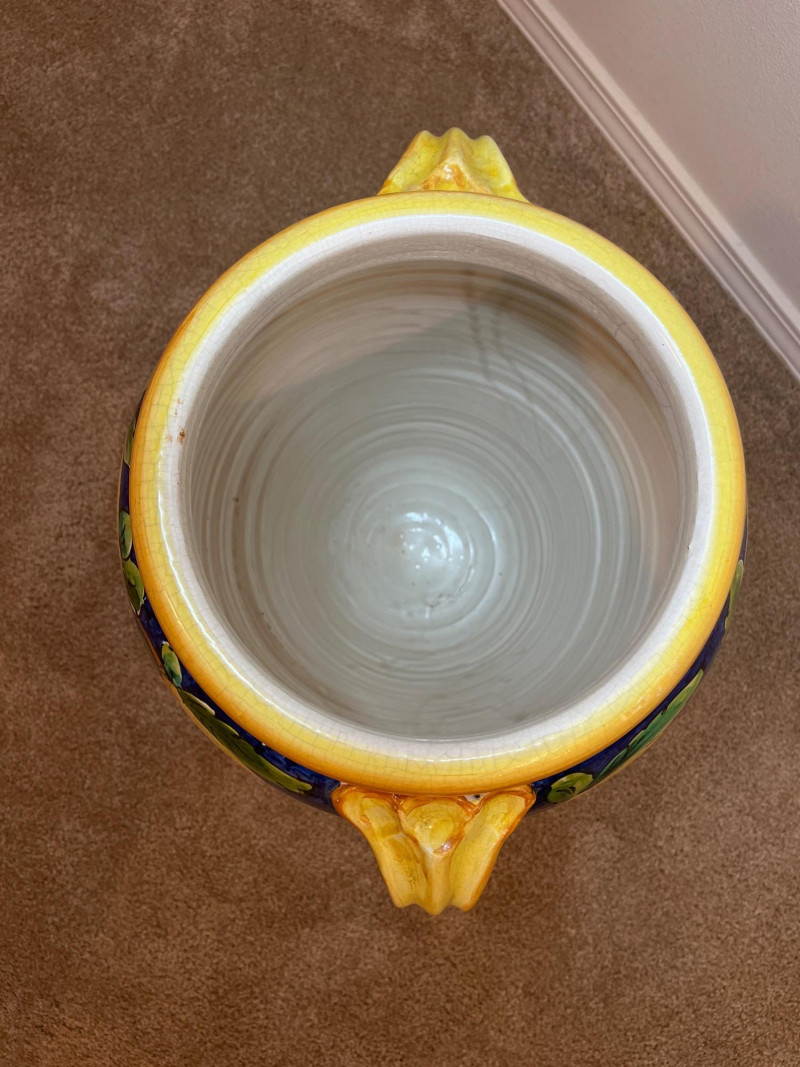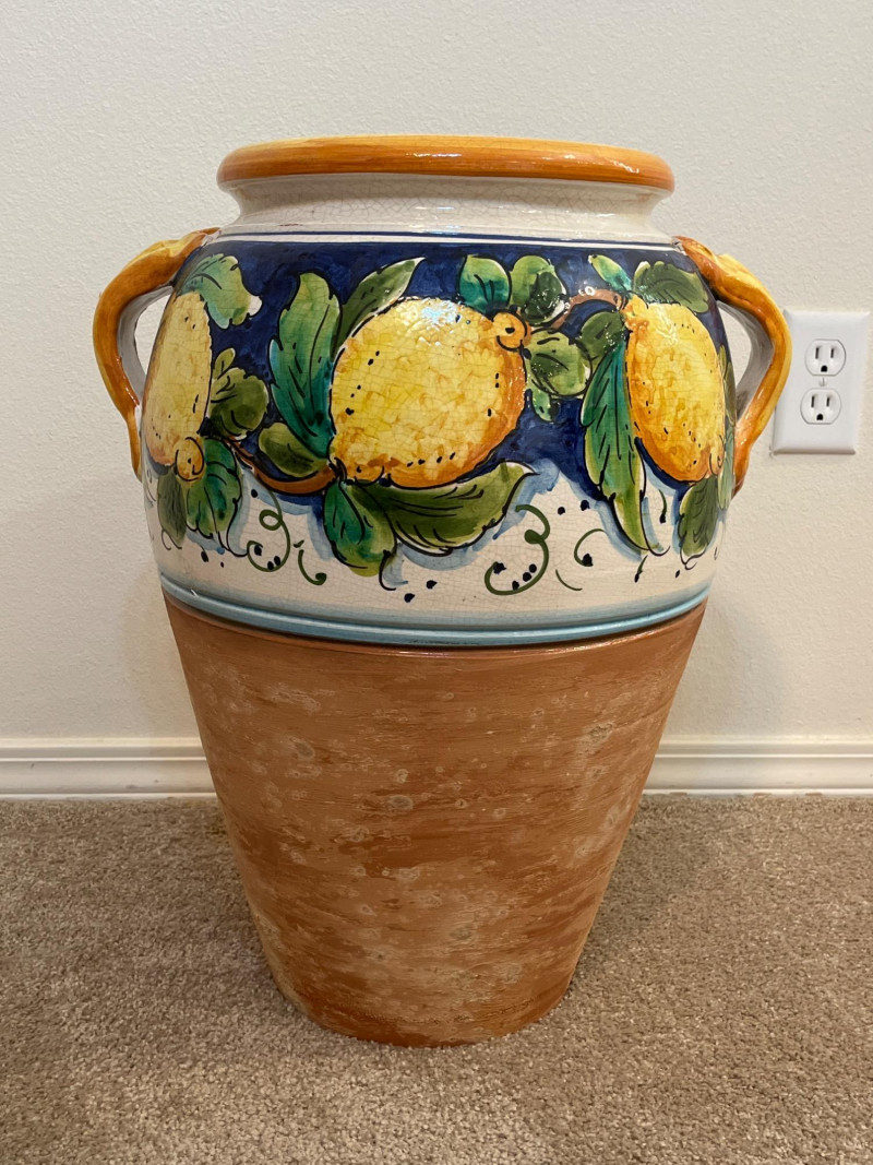 Large Italian Ceramic Lemon Themed Vase or Umbrella Stand Stands 19 1/2" tall and is very heavy. Stamped on the bottom, "Handpainted in Italy". The finish over the lemon painted portion has a crackle effect adding to its rustic charm. The bottom terra cotta portion is unglazed but smooth. The inside and underside are glazed and shiny.
