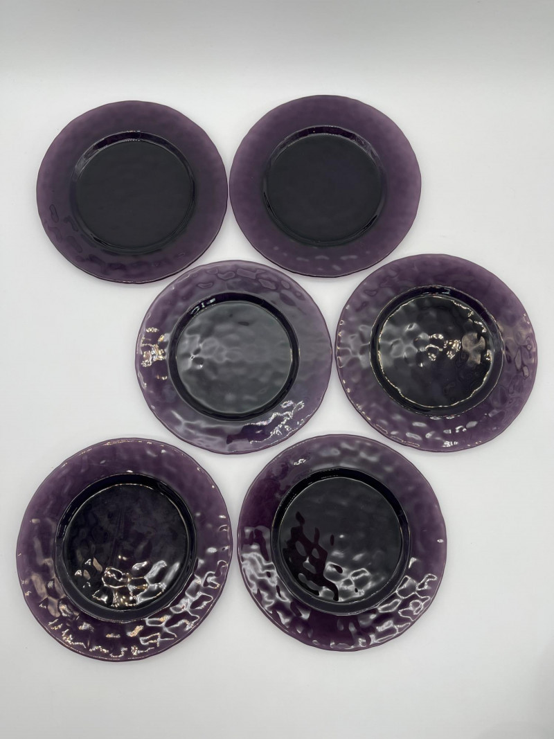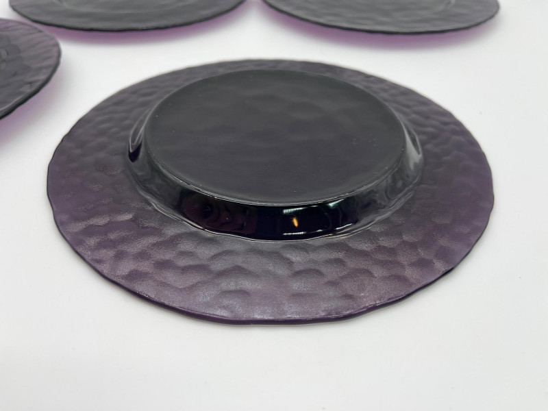 Purple Bormioli Rocco Glass Forum Bowls and Palatina Salad Plates These are all made by Bormioli Rocco. are different patterns but the same color. The plates are the Palatina pattern while the bowls are the Forum pattern. Bormioli Rocco has been manufacturing glass since 1825 and they have perfected matching high quality with timeless style. Plates are 8" wide and bowls are 5 1/2" wide.