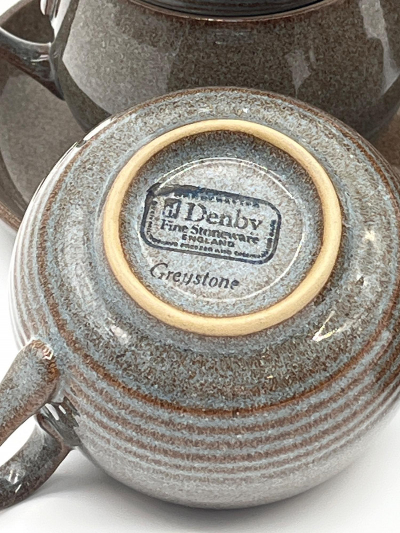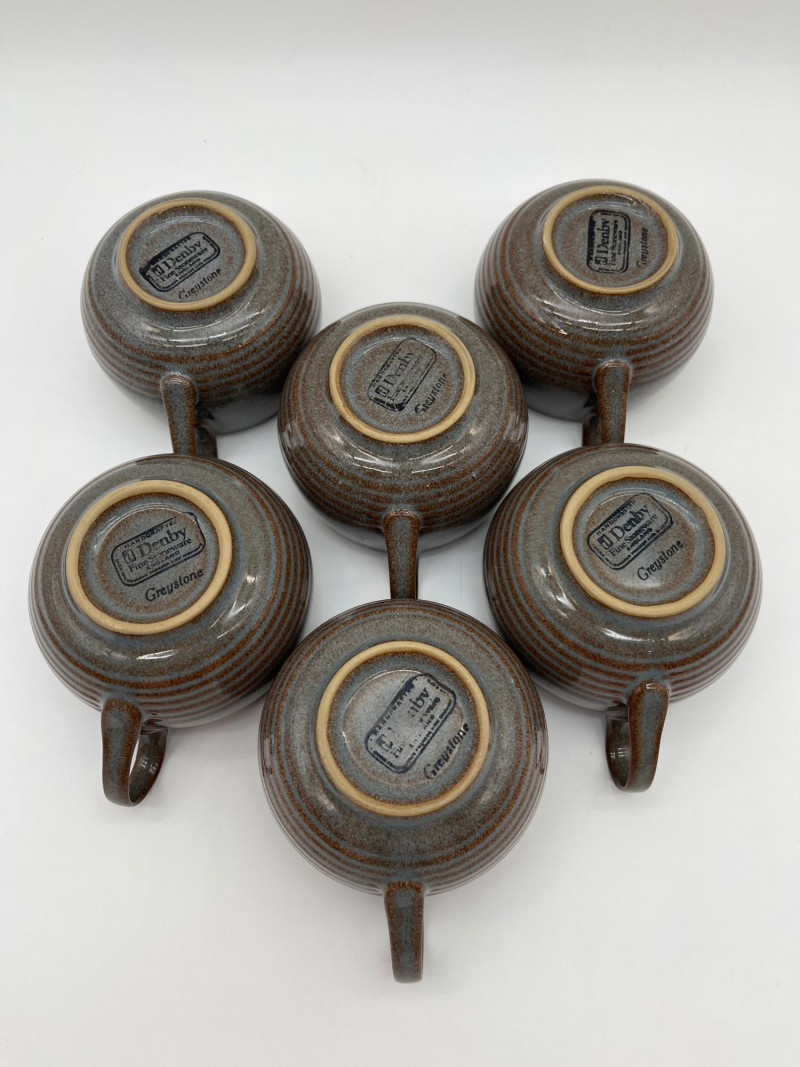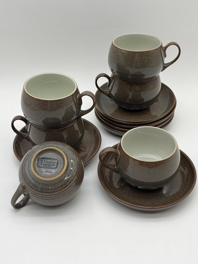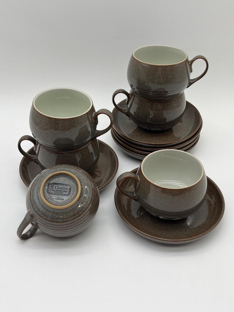 Denby Greystone 12 Piece Cup and Saucer Set This set includes 6 cups and 6 saucers. Denby is world famous for their high quality and stylish style. If you've never owned a piece of Denby, you don't know what you're missing out on!