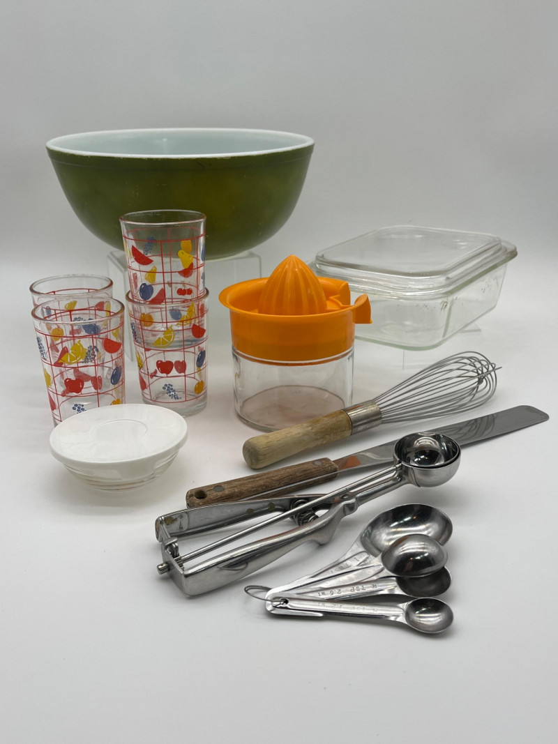 Vintage Kitchen featuring Pyrex 404 Bowl This fun lot includes everything shown. Please consider that these are vintage pieces and so they have flaws that are consistent with their age. See photos for details.