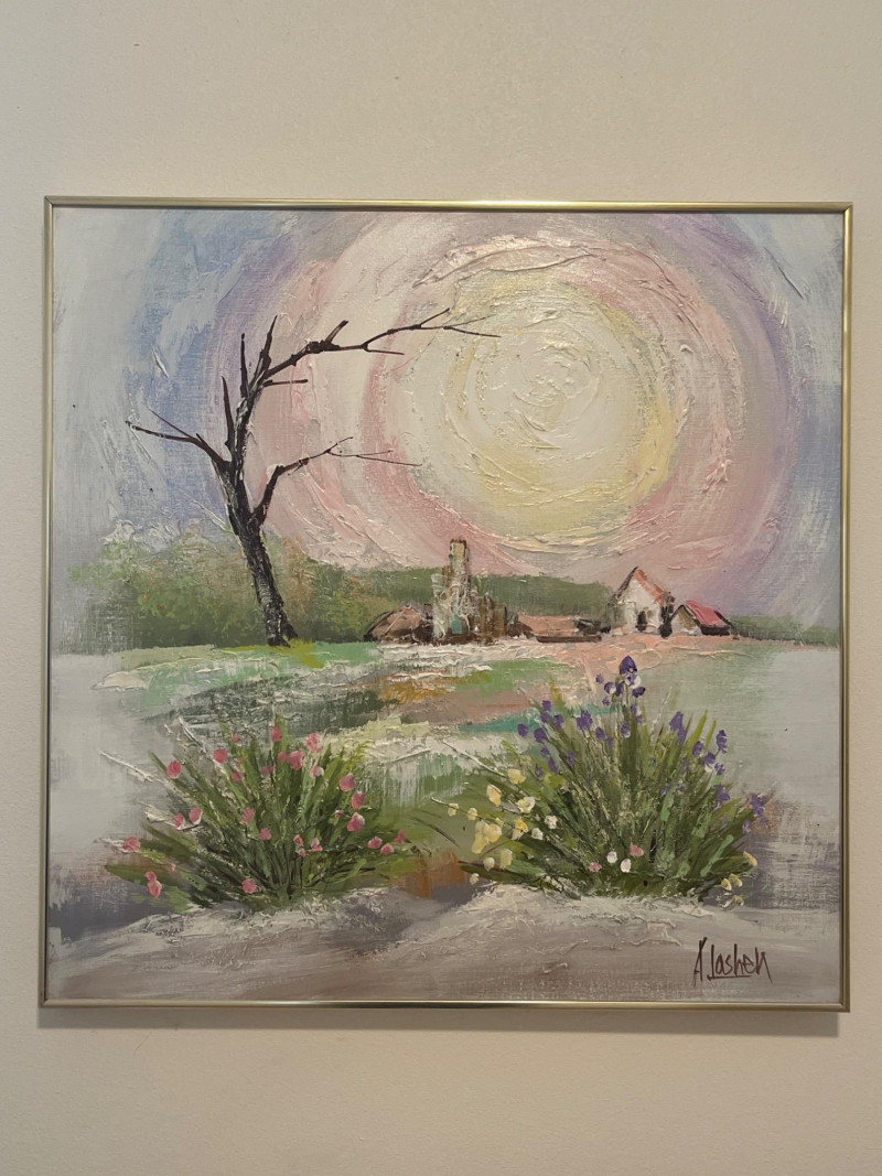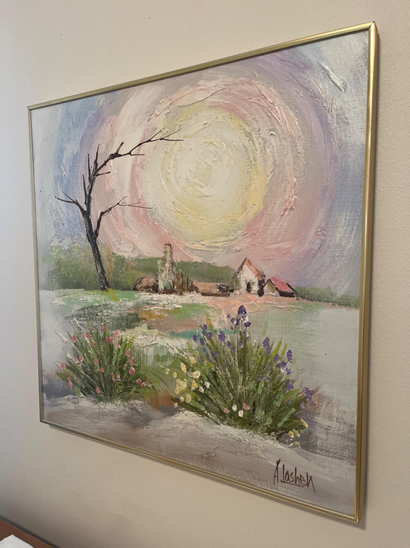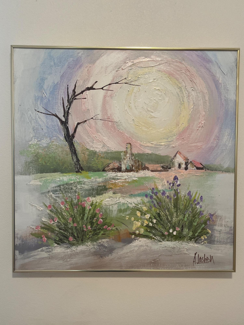 Professionally Framed Oil Painting Signed by Artist Measures 30" square and is in good condition.