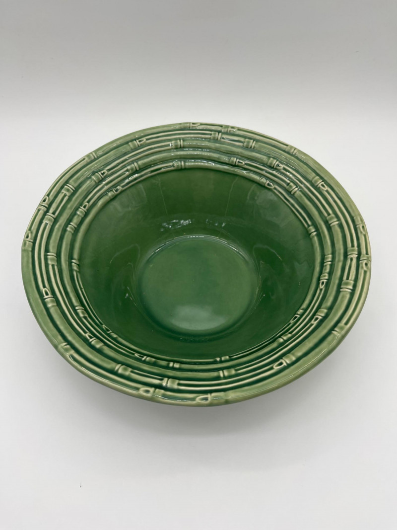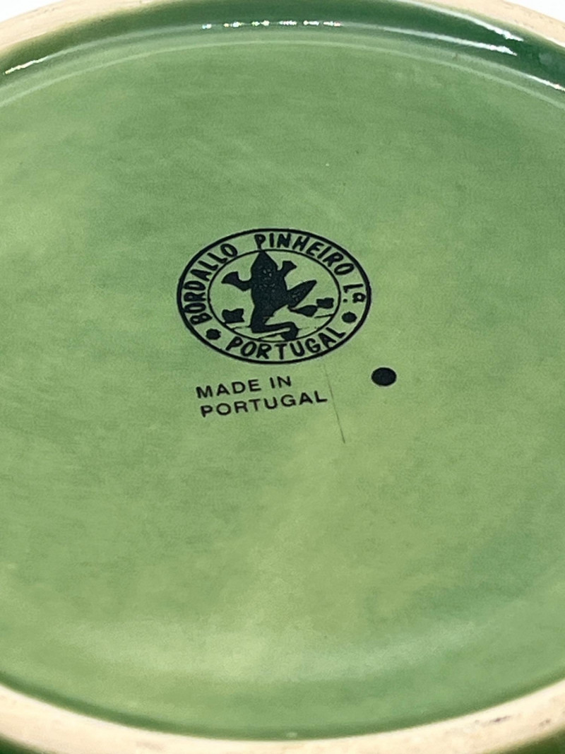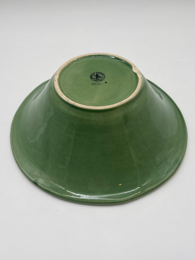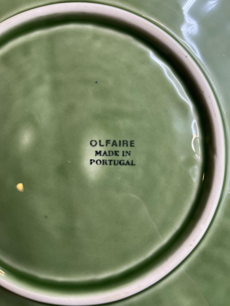 Green Portuguese Pottery Featuring Olfaire & Bordallo Pinheiro Pieces In good condition with no cracks or crazing that I see. The bowl does have a chip on the bottom as shown in photos.