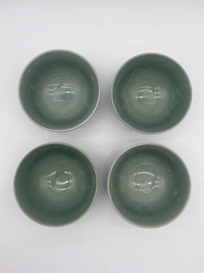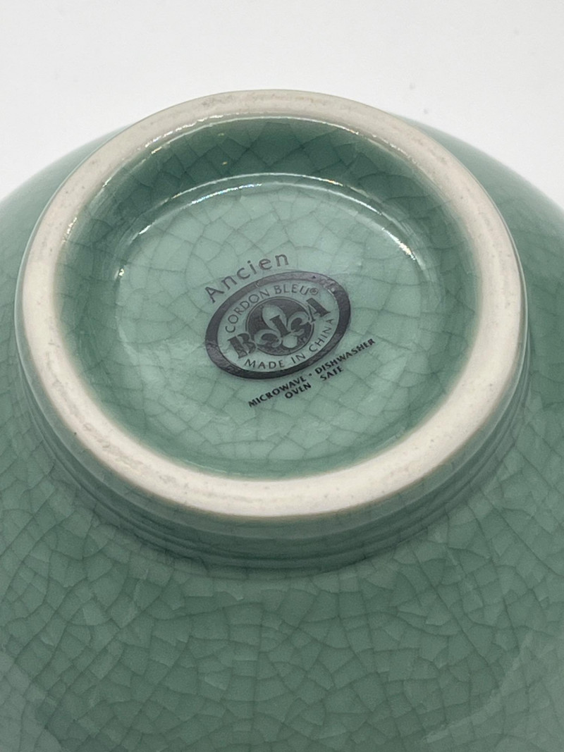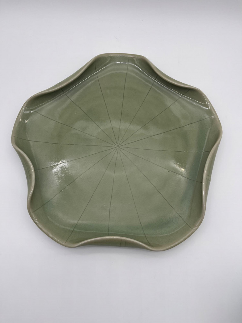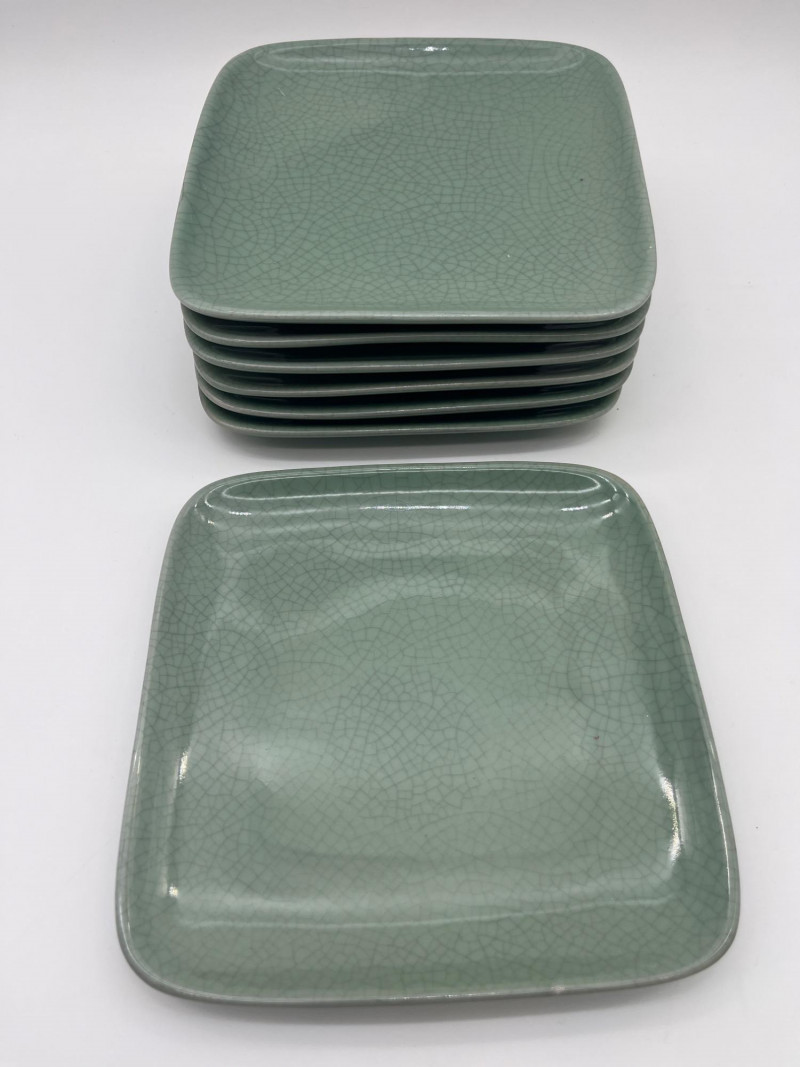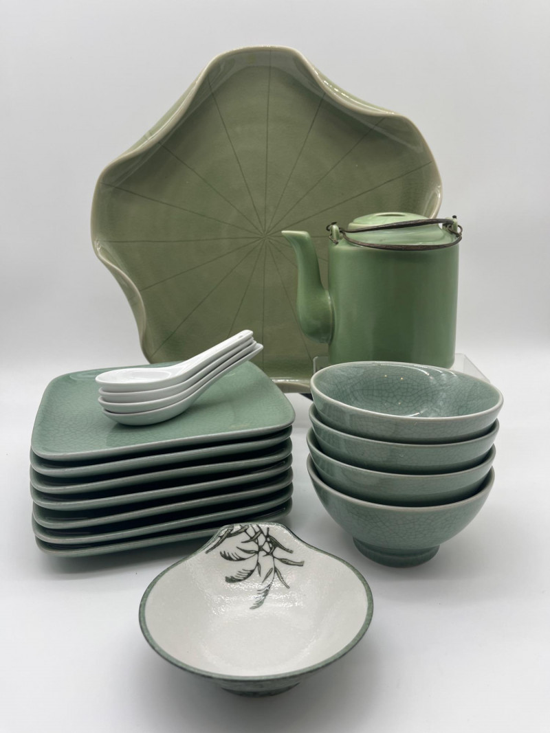 Assorted Celadon Ceramic Dishes and Teapot Lot Celadon pottery is an Asian style pottery first invented in 17th century China, treasured for its jade green to blue-green color. This affect is accomplished not by the pigmentation of the glaze but rather by the reaction of the iron-oxide to the high temperature during the firing process. More often than not, a crackled design appears below the surface of the glaze adding to the dramatic appearance of this fascinating pottery. All of these pieces are quite modern but beautiful in their own right. For perspective, the platter is 14" wide and the salad plates are 7 1/2" wide. The last item is not technically a celadon piece but fits with the style of this lot.