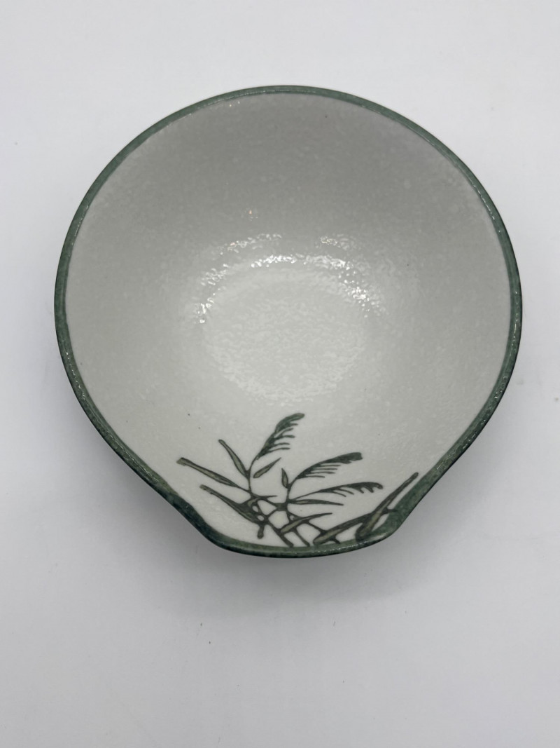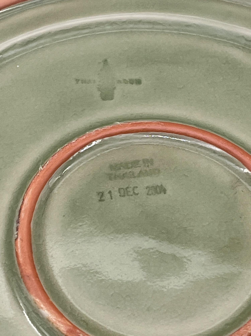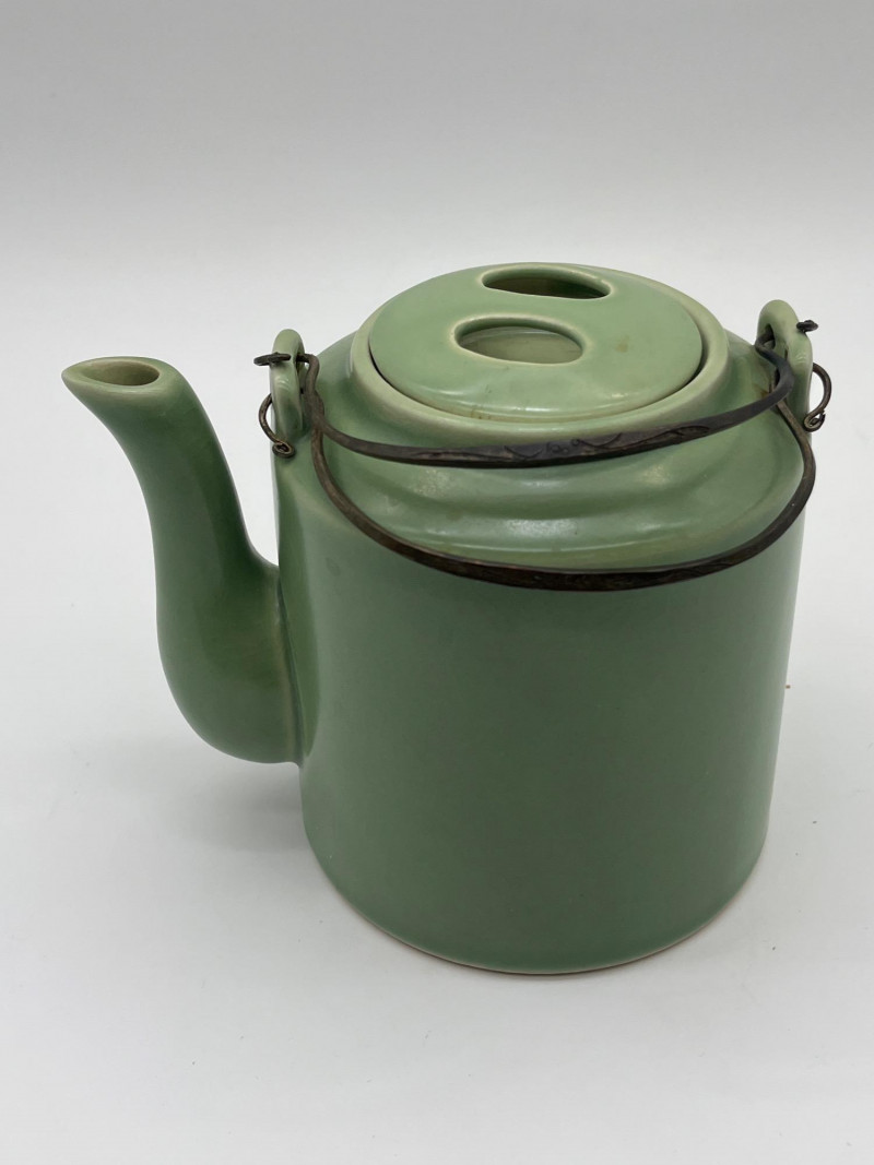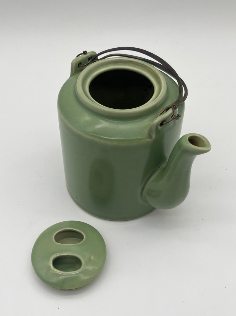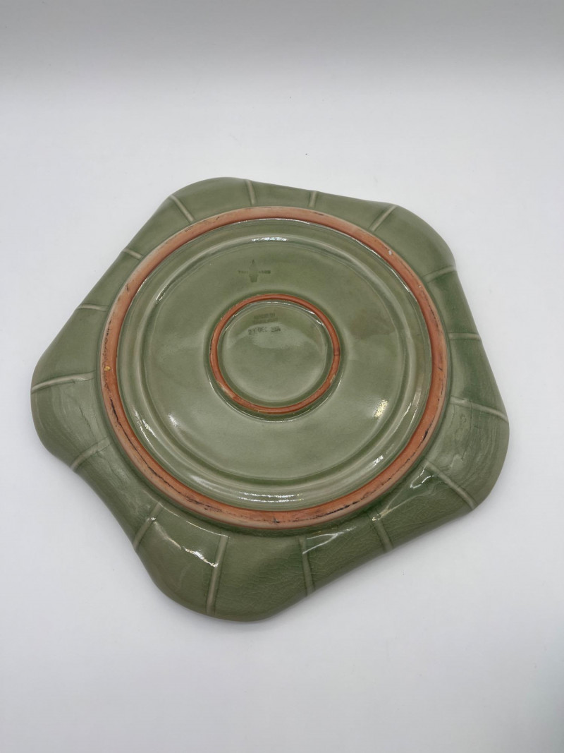 Assorted Celadon Ceramic Dishes and Teapot Lot Celadon pottery is an Asian style pottery first invented in 17th century China, treasured for its jade green to blue-green color. This affect is accomplished not by the pigmentation of the glaze but rather by the reaction of the iron-oxide to the high temperature during the firing process. More often than not, a crackled design appears below the surface of the glaze adding to the dramatic appearance of this fascinating pottery. All of these pieces are quite modern but beautiful in their own right. For perspective, the platter is 14" wide and the salad plates are 7 1/2" wide. The last item is not technically a celadon piece but fits with the style of this lot.