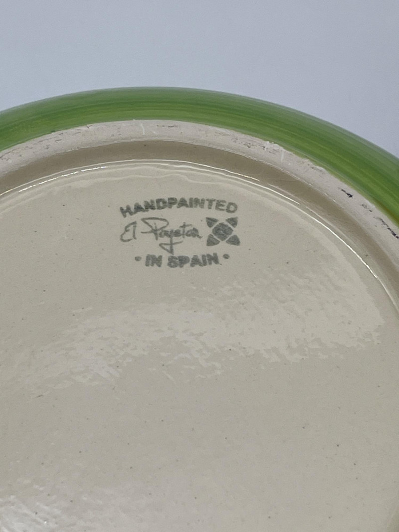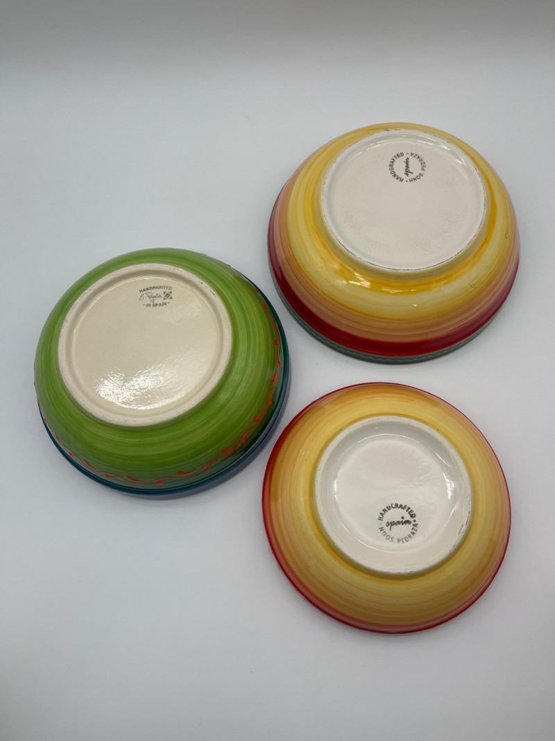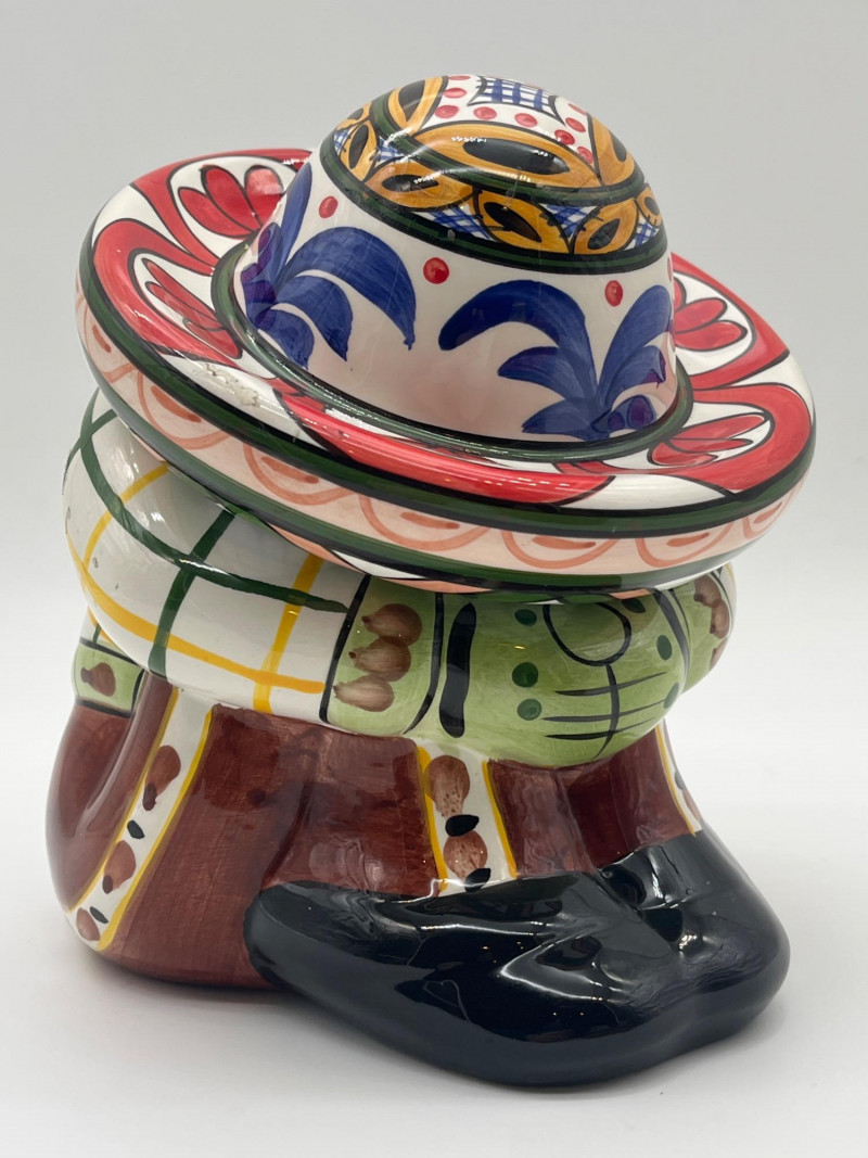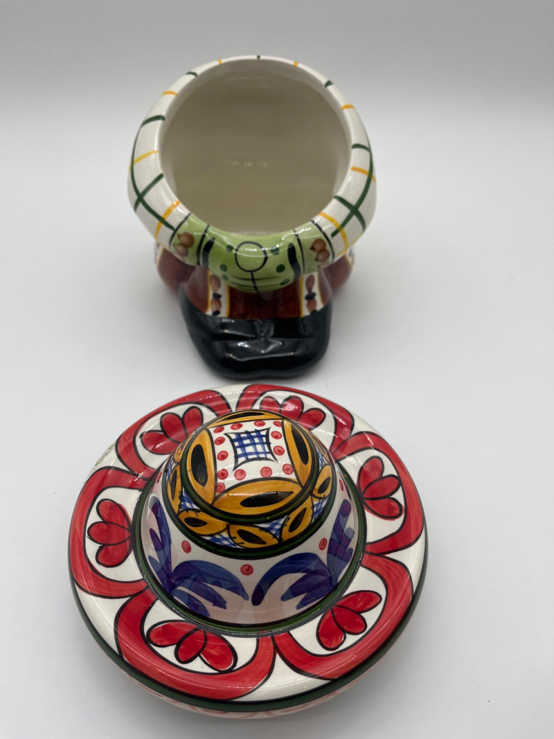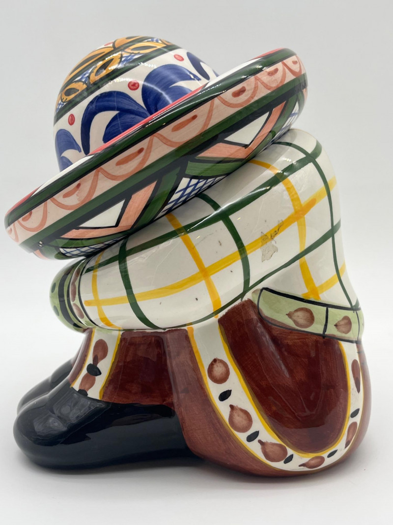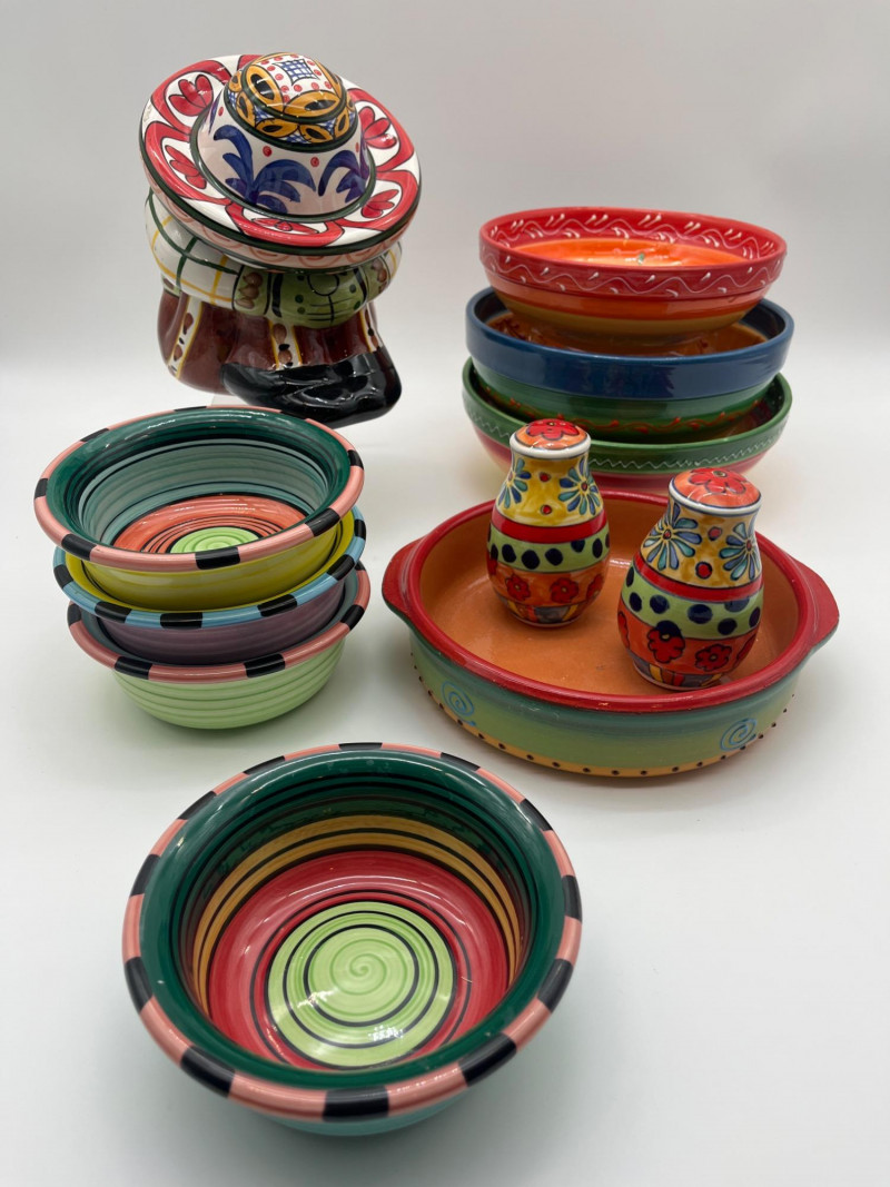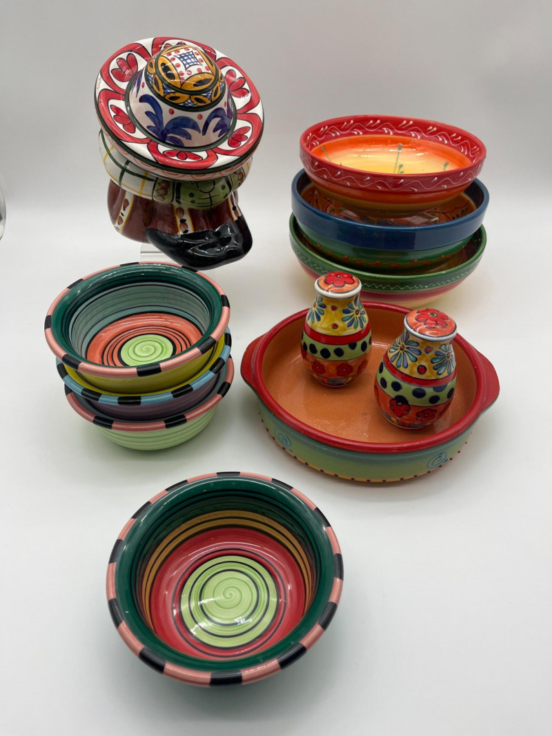 Colorful Talavera Pottery Lot This lot includes everything shown including four serving sized bowls, four cereal sized bowls, and salt & pepper/seasoning shakers but what steals the show is the "Sleeping Panchito" canister. All pieces are in good condition with no cracks. One bowl has two small chips on the rim which I show in a closeup photo.