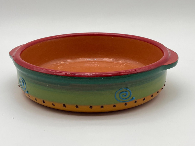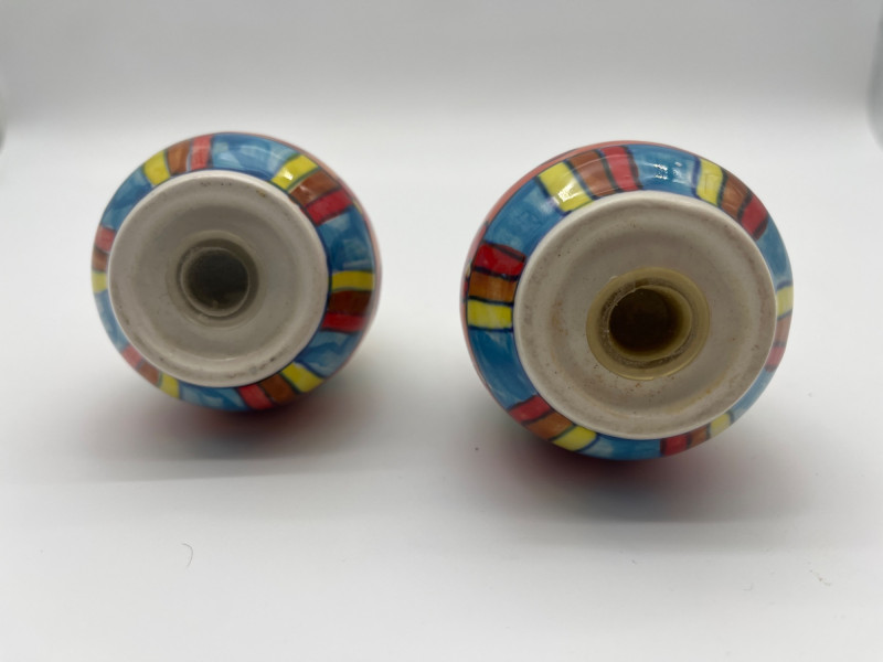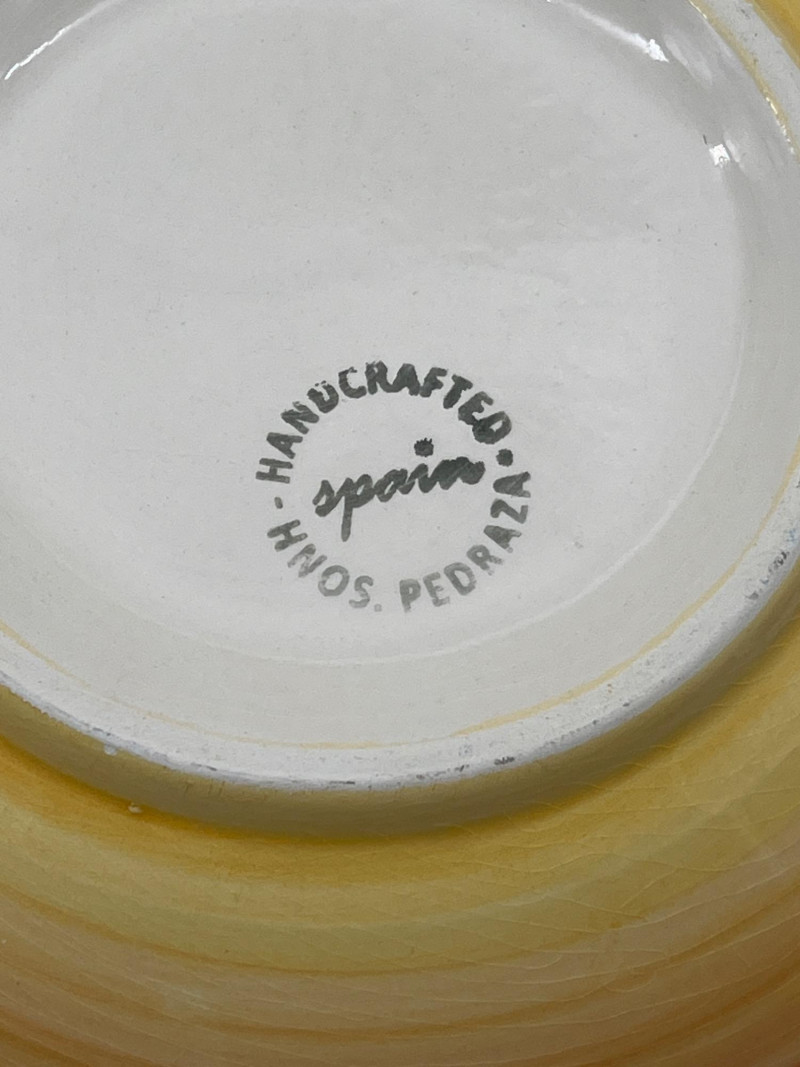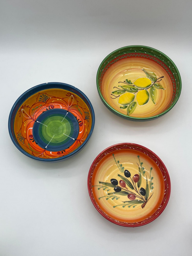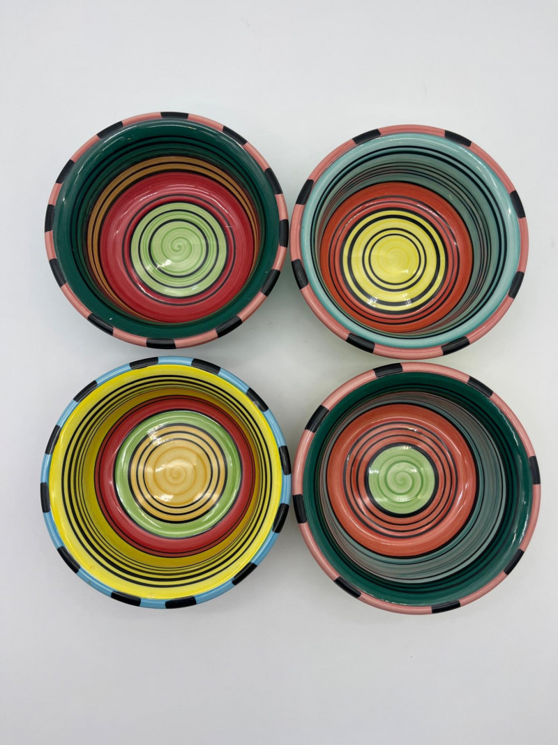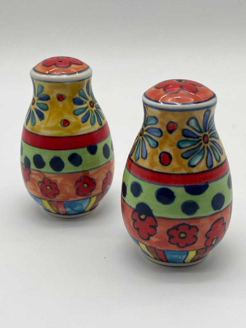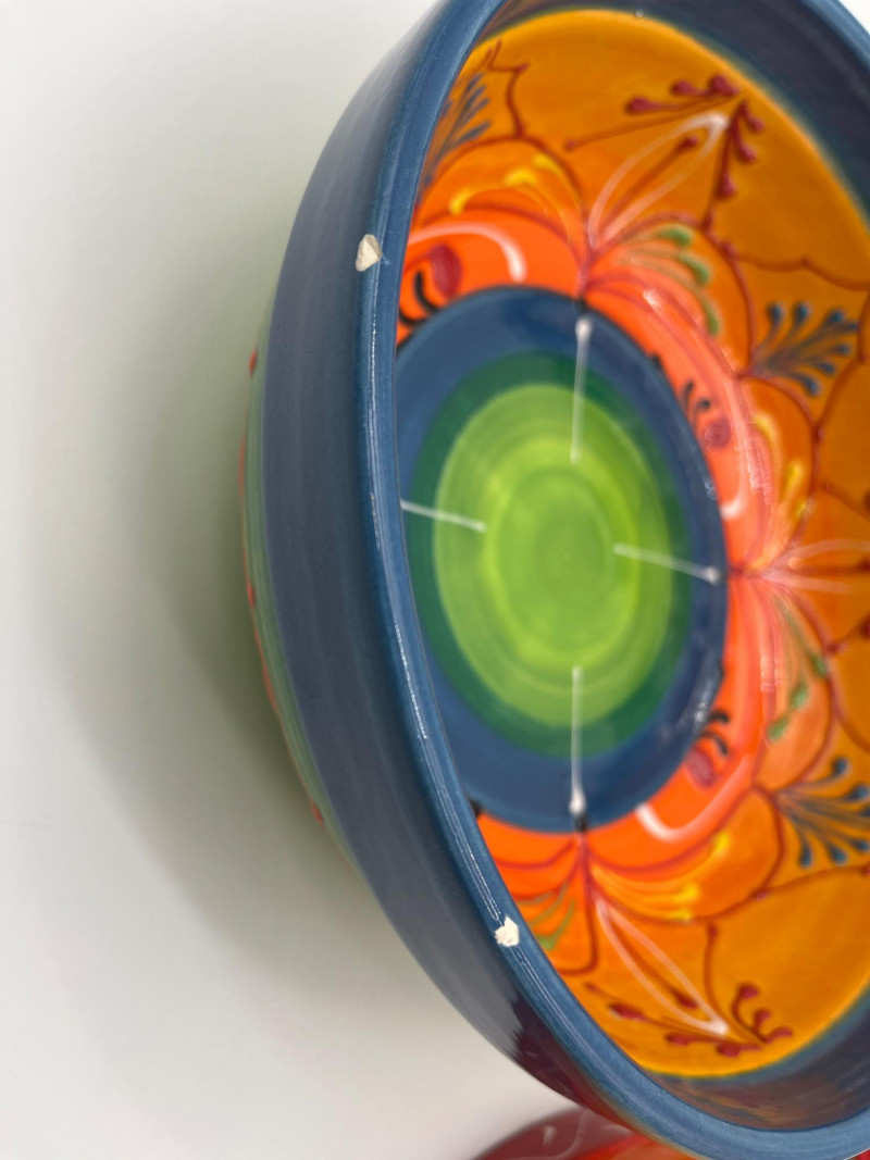 Colorful Talavera Pottery Lot This lot includes everything shown including four serving sized bowls, four cereal sized bowls, and salt & pepper/seasoning shakers but what steals the show is the "Sleeping Panchito" canister. All pieces are in good condition with no cracks. One bowl has two small chips on the rim which I show in a closeup photo.