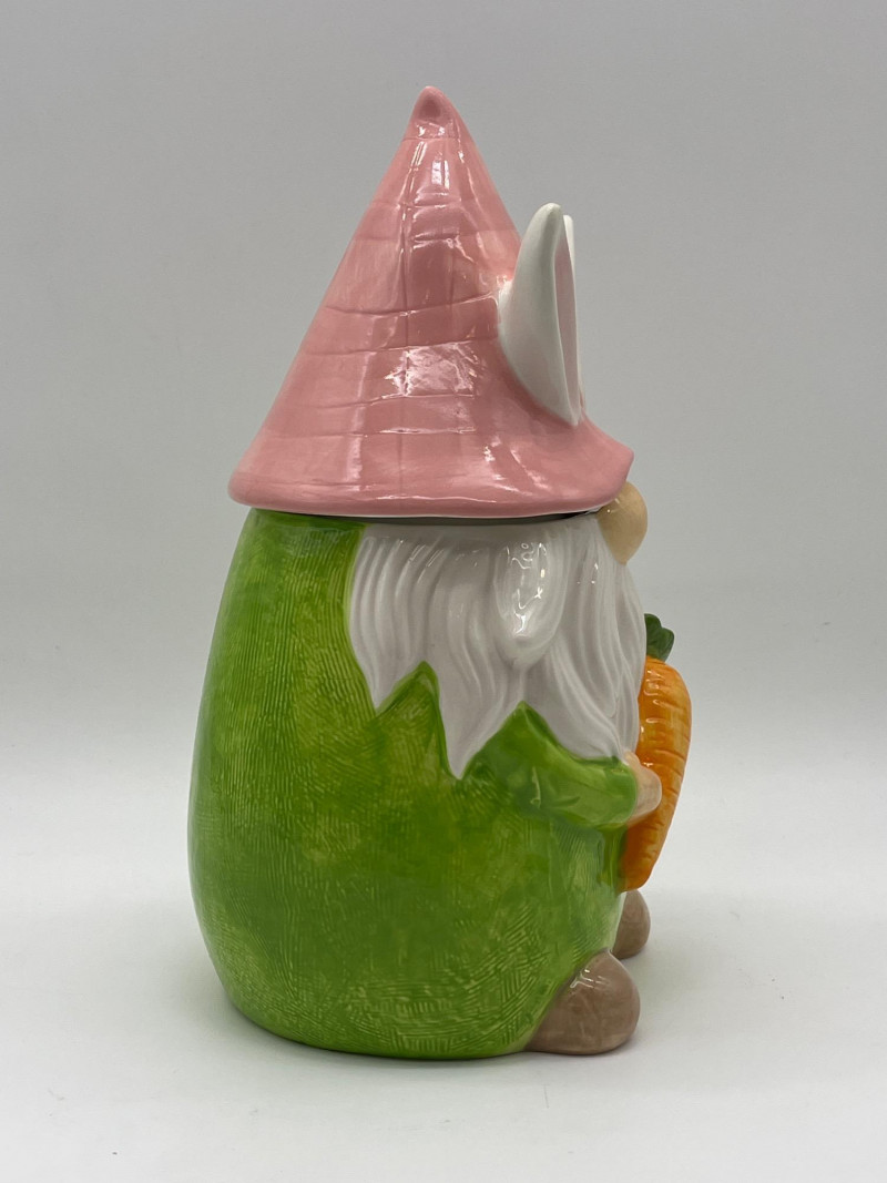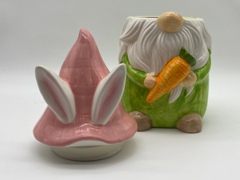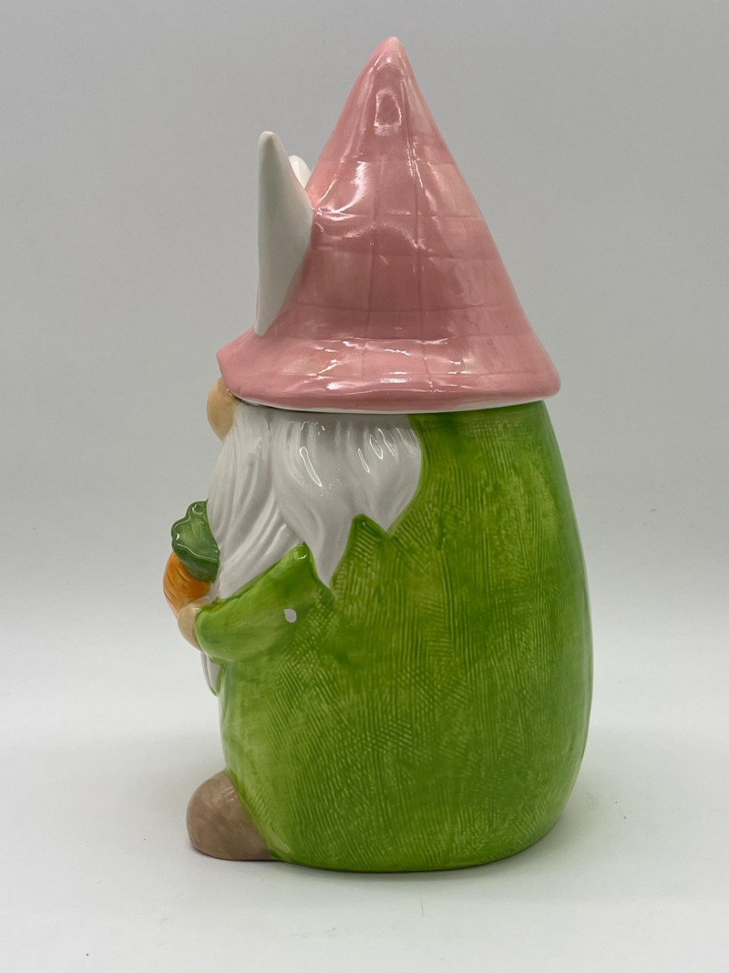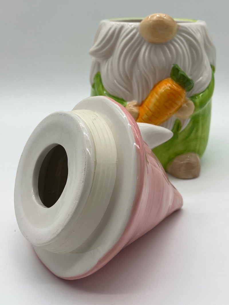 Gnome Cookie Jar This little dude is as ready for spring as I am! He's in good condition with just a little chip on his side which I show close-up in photos.