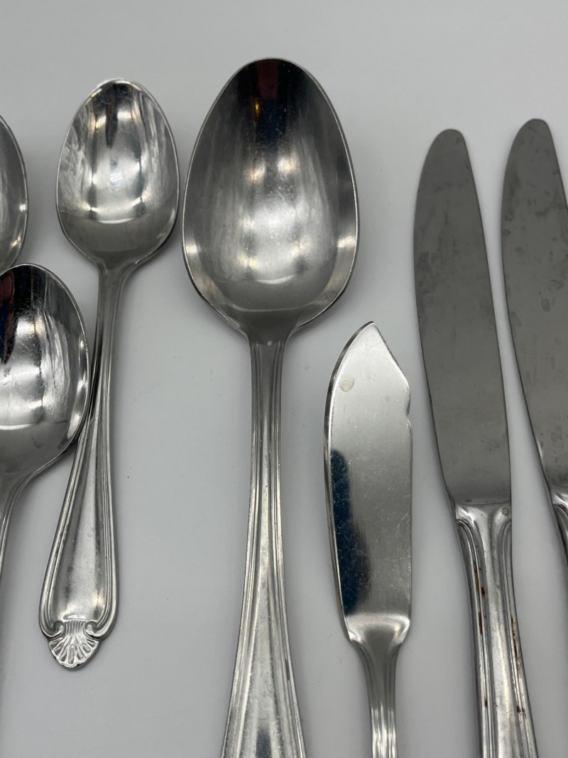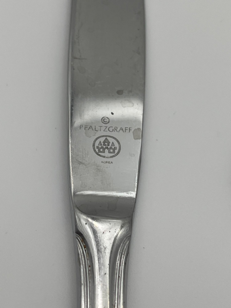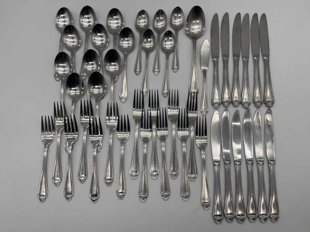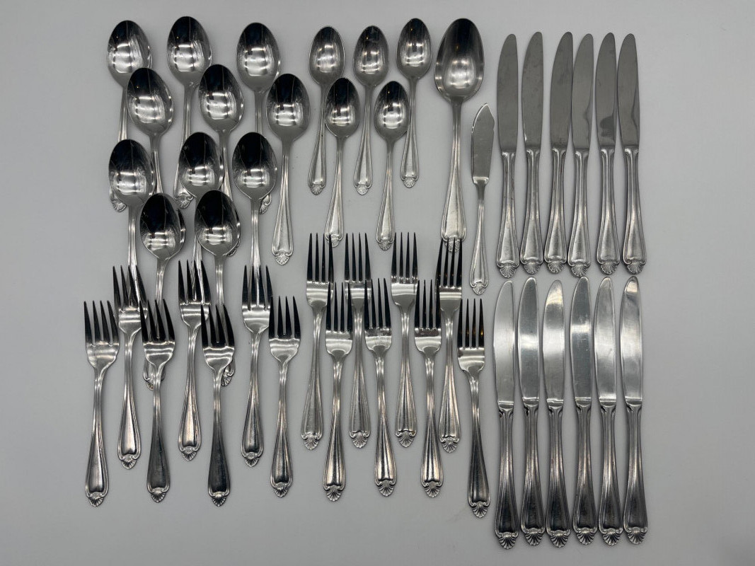 Pfaltzgrafff Biscayne Pattern Stainless Flatware 45 Piece Set This set includes 11 tablestpoons, 5 teaspoons, 7 salad forks, 8 dinner forks, 12 dinner knives, one serving spoon and one butter spreading knife. These pieces have minimal signs of wear (scratches).