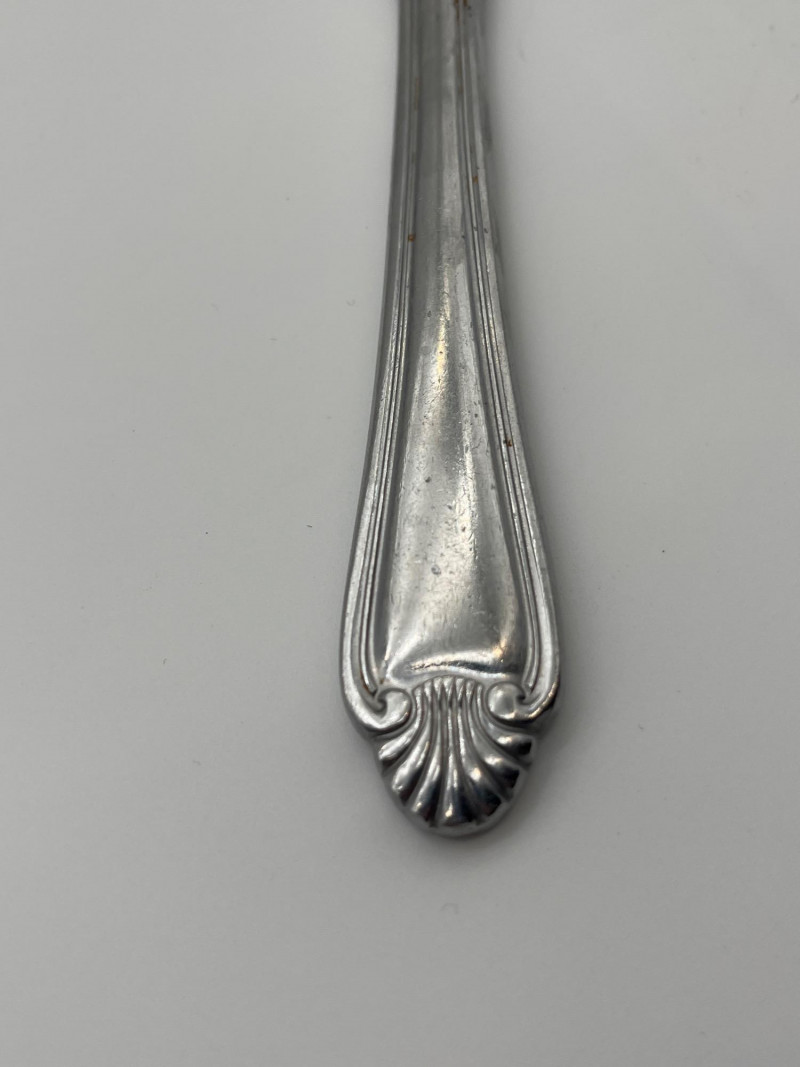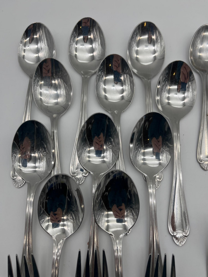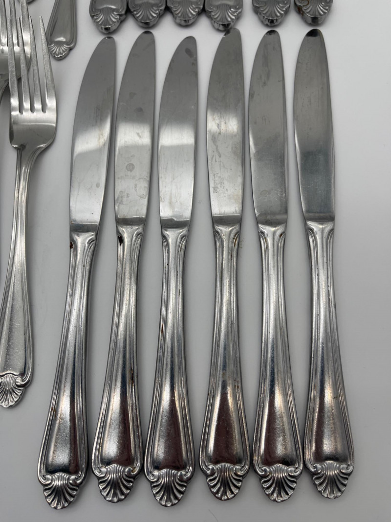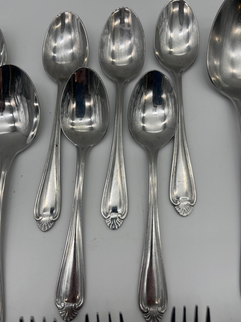 Pfaltzgrafff Biscayne Pattern Stainless Flatware 45 Piece Set This set includes 11 tablestpoons, 5 teaspoons, 7 salad forks, 8 dinner forks, 12 dinner knives, one serving spoon and one butter spreading knife. These pieces have minimal signs of wear (scratches).