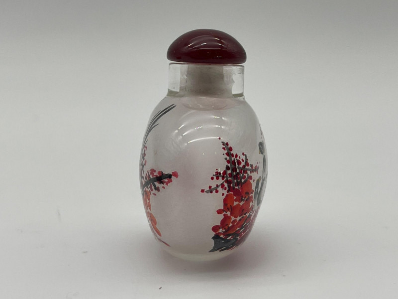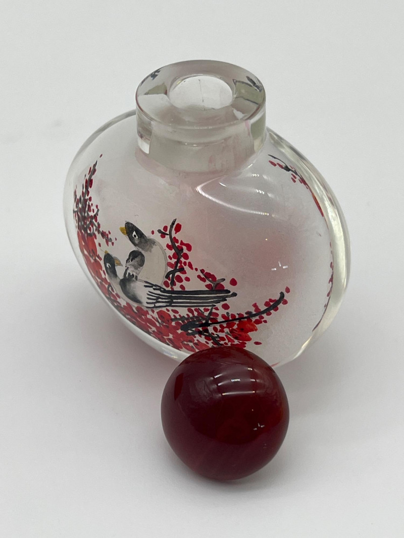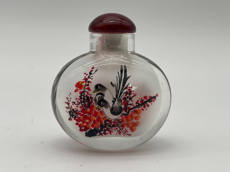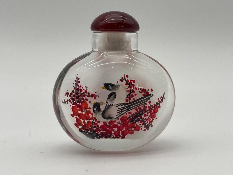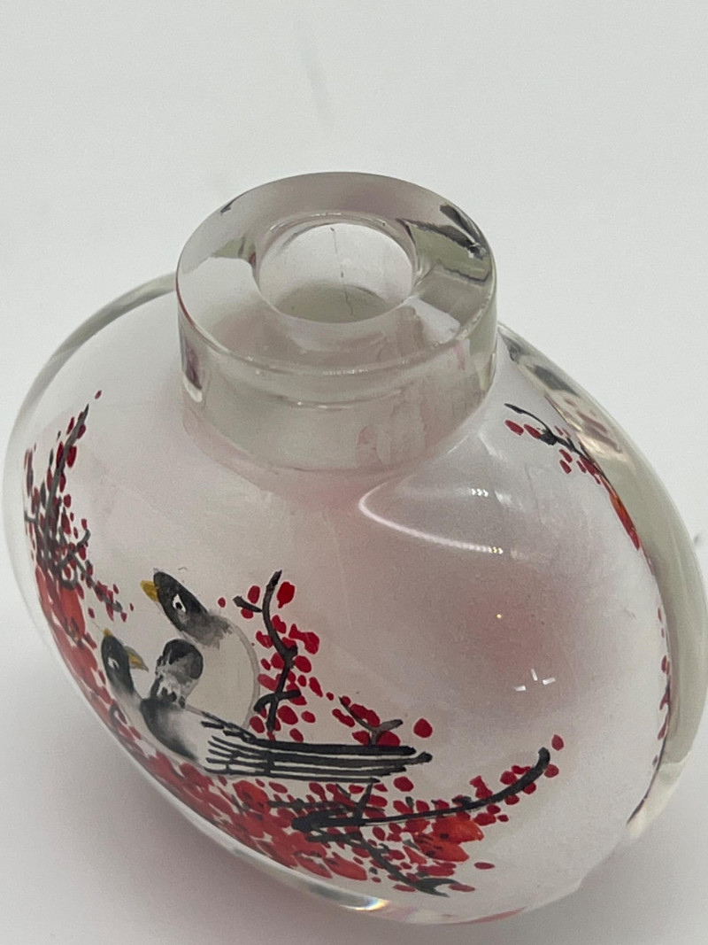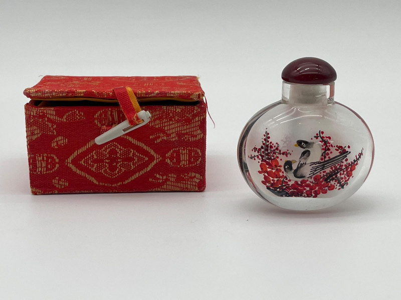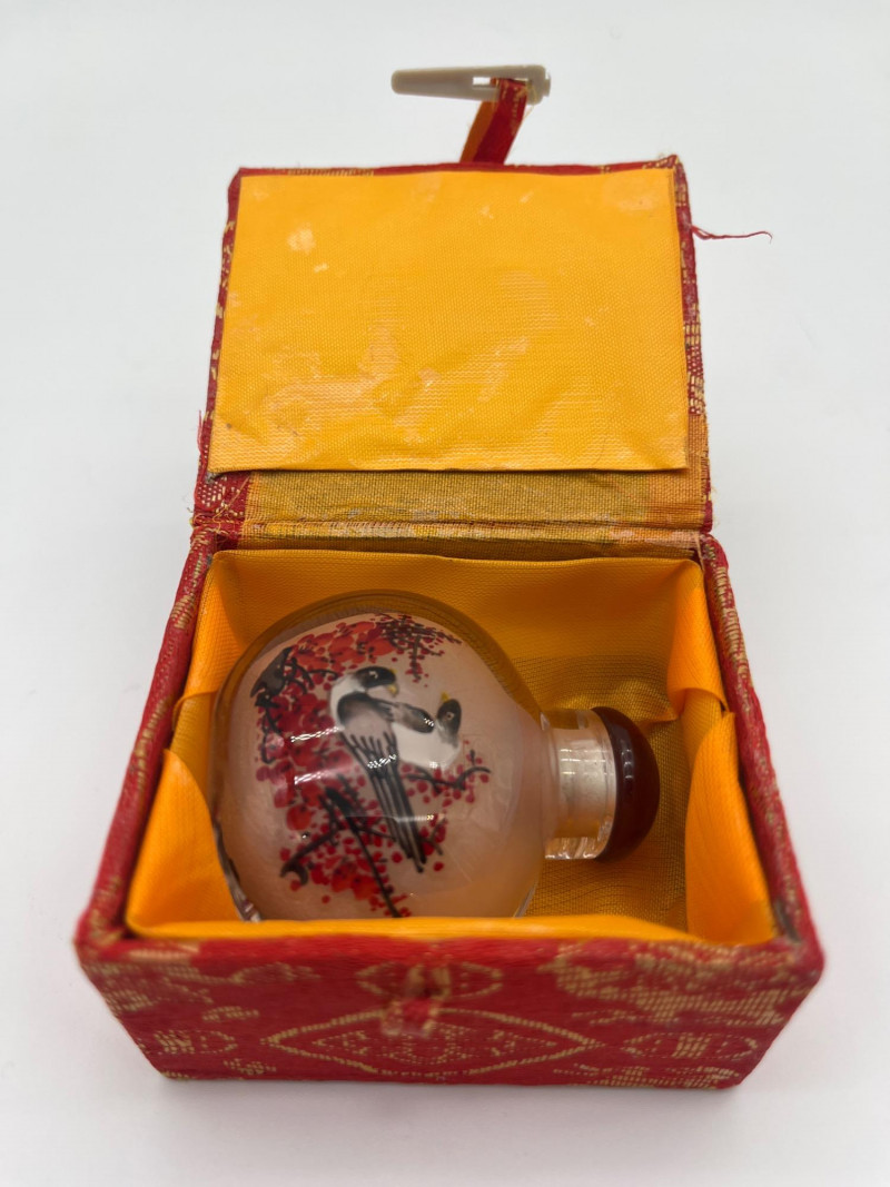 Reverse Painted 2" Tall Glass Snuff Bottle Features intricate trees and birds painted inside the glass bottle. Includes a satin lined box to keep it safe from damage.