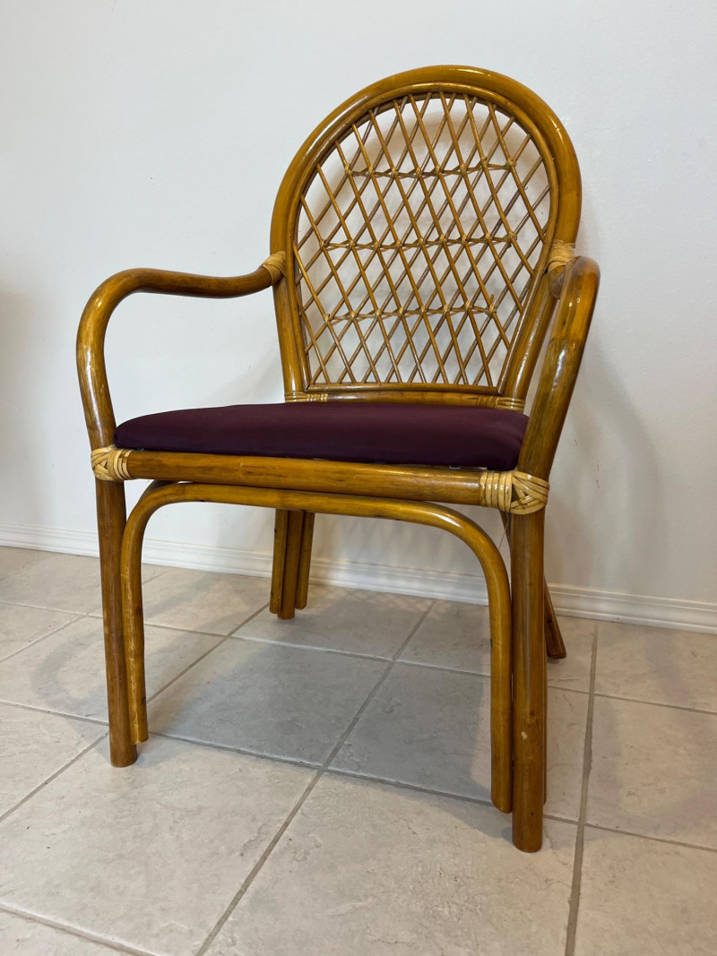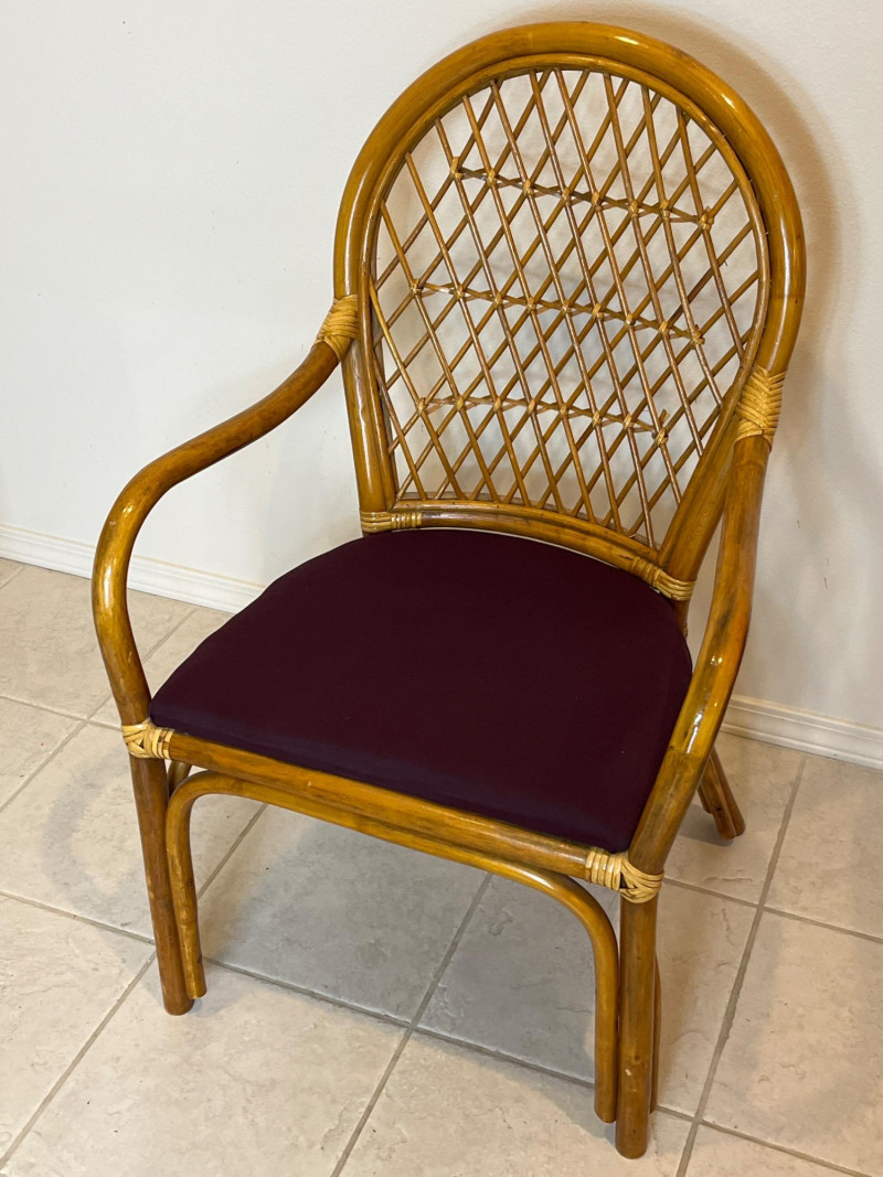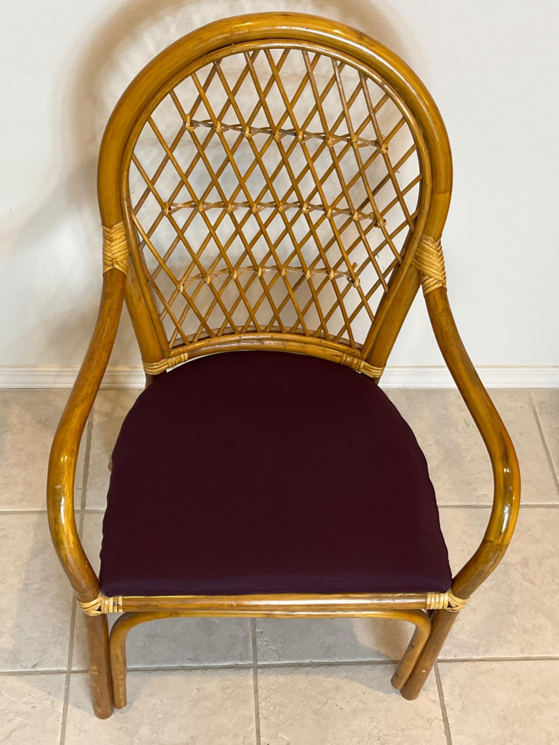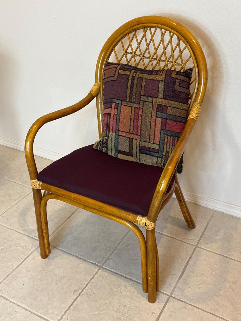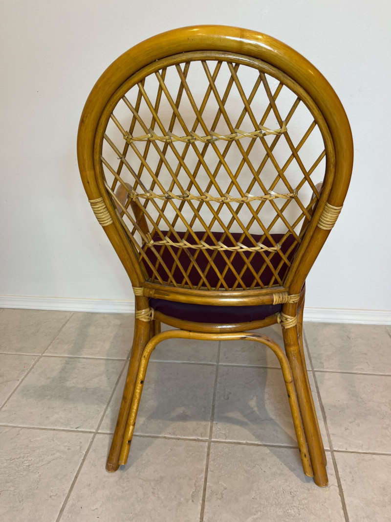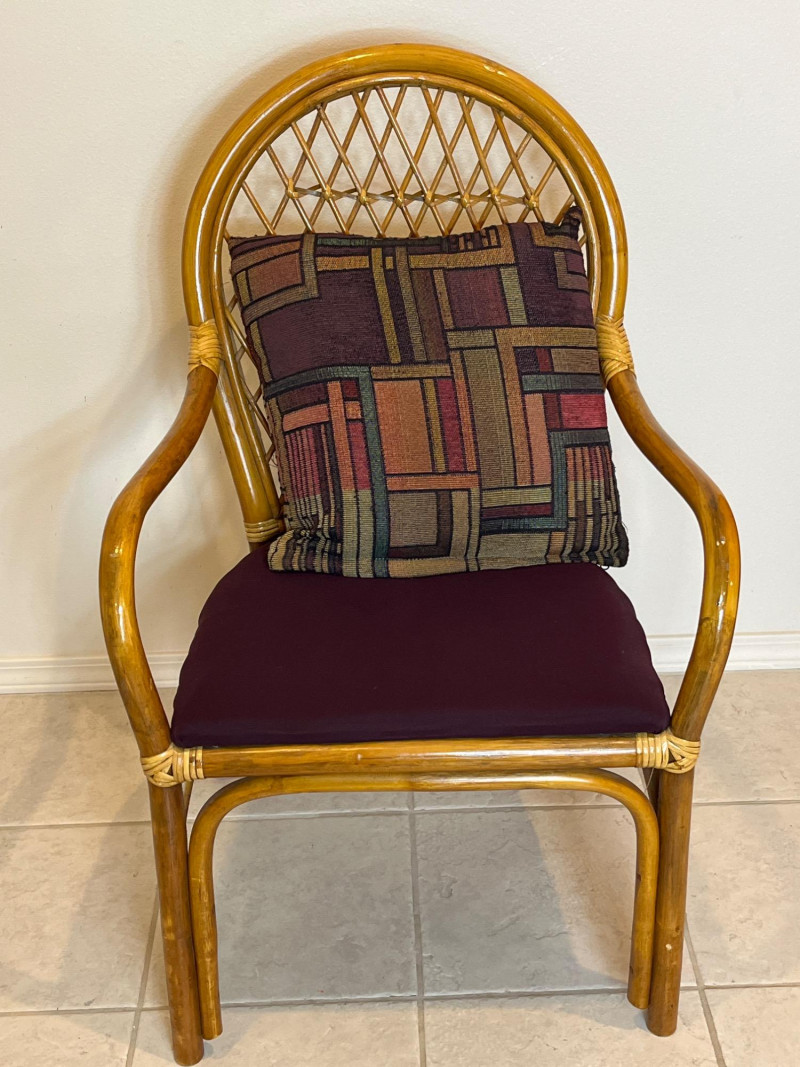 Bamboo Accent Chair with Purple Cushion and Pillow In very good condition and measures 37" tall, 22" wide.
