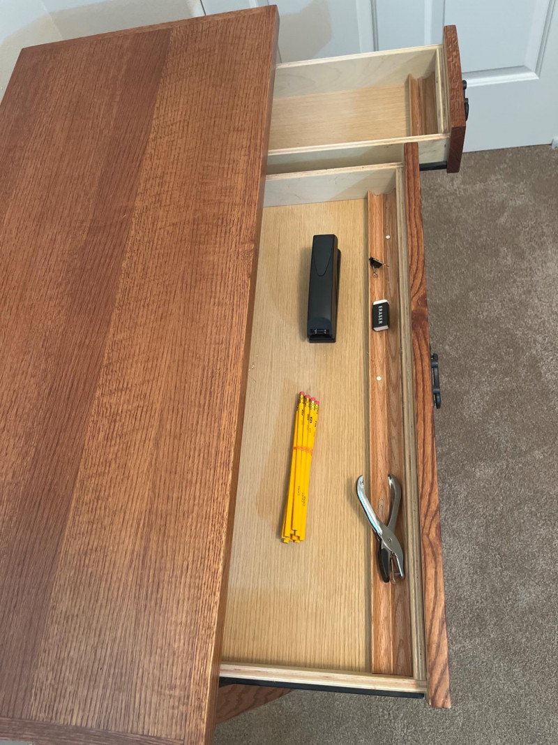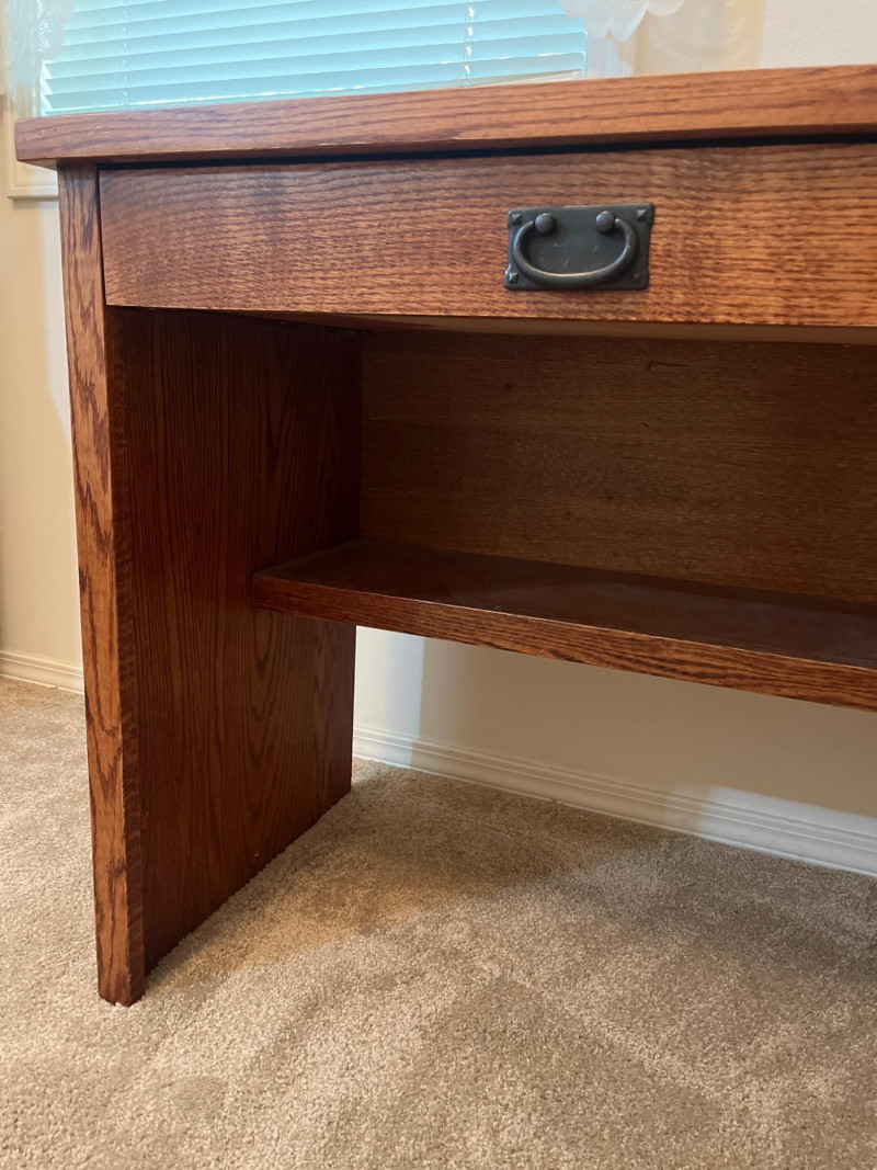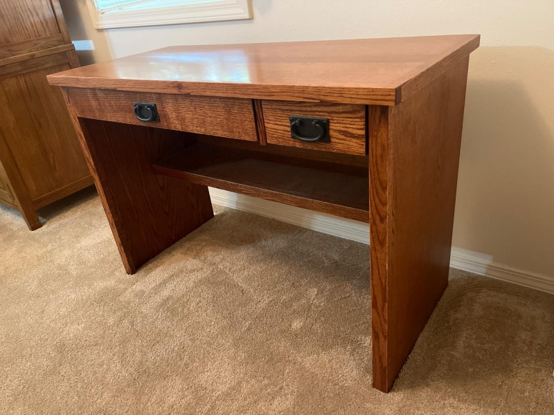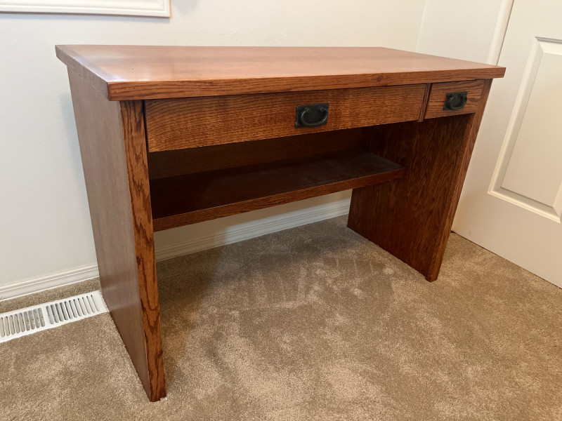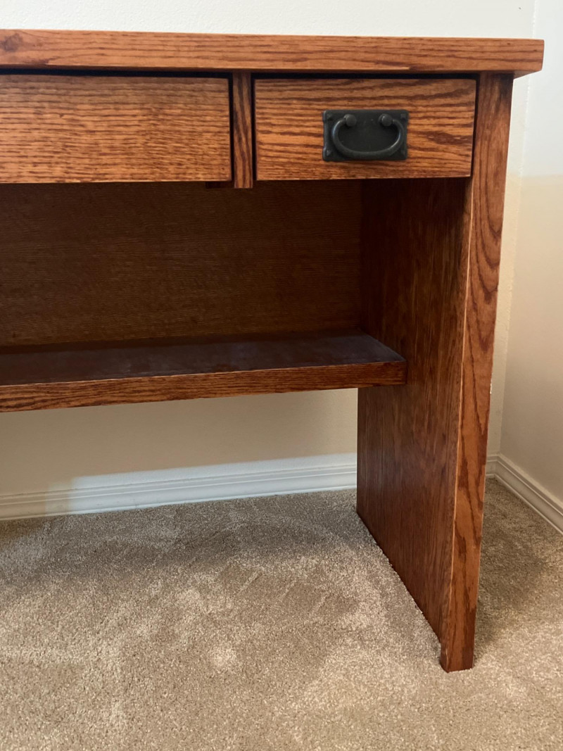 Mahogany Style Finish Desk This is a mahogany veneer desk that looks to have never been used. There are no signs of wear and the drawers pull out easily. There is a lower shelf for a power strip or other hardware. Includes a few various office supplies as shown in photos. 43 1/2" long, 19 3/4" deep, and 30" tall