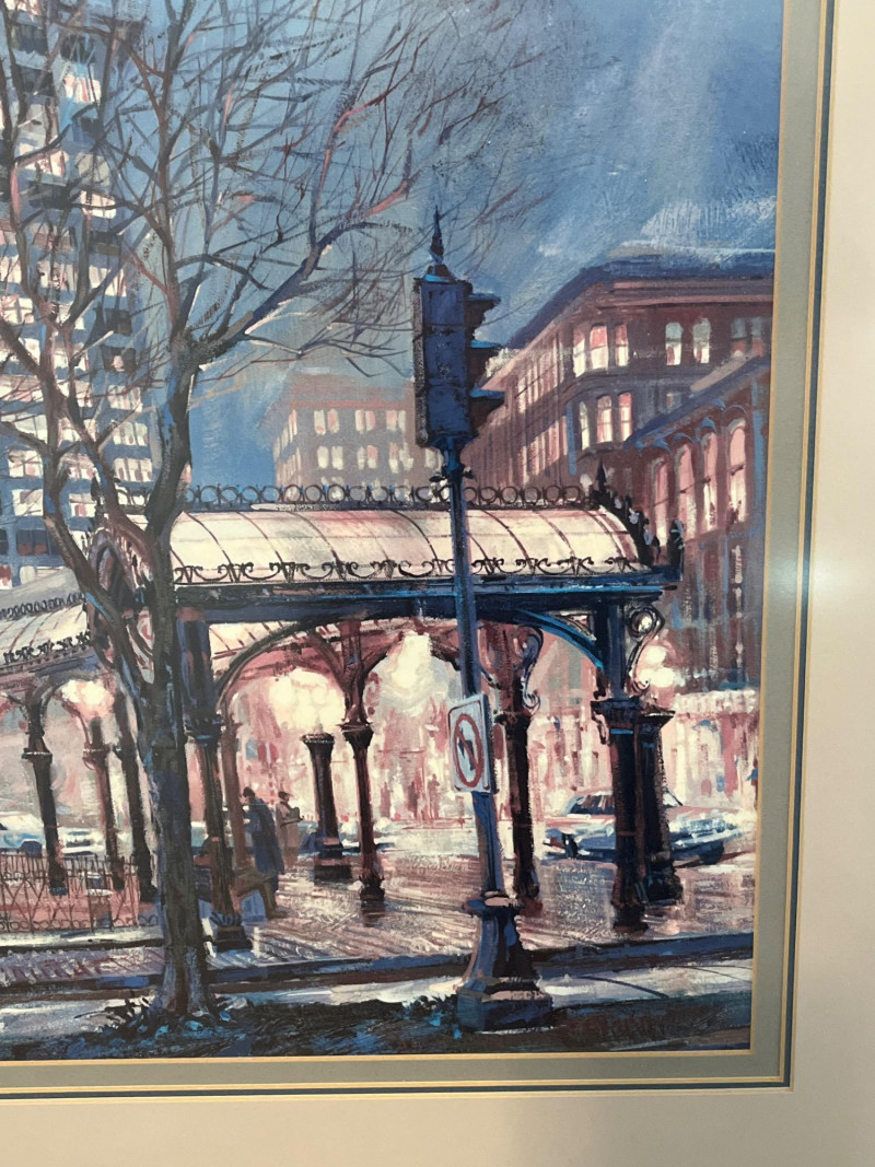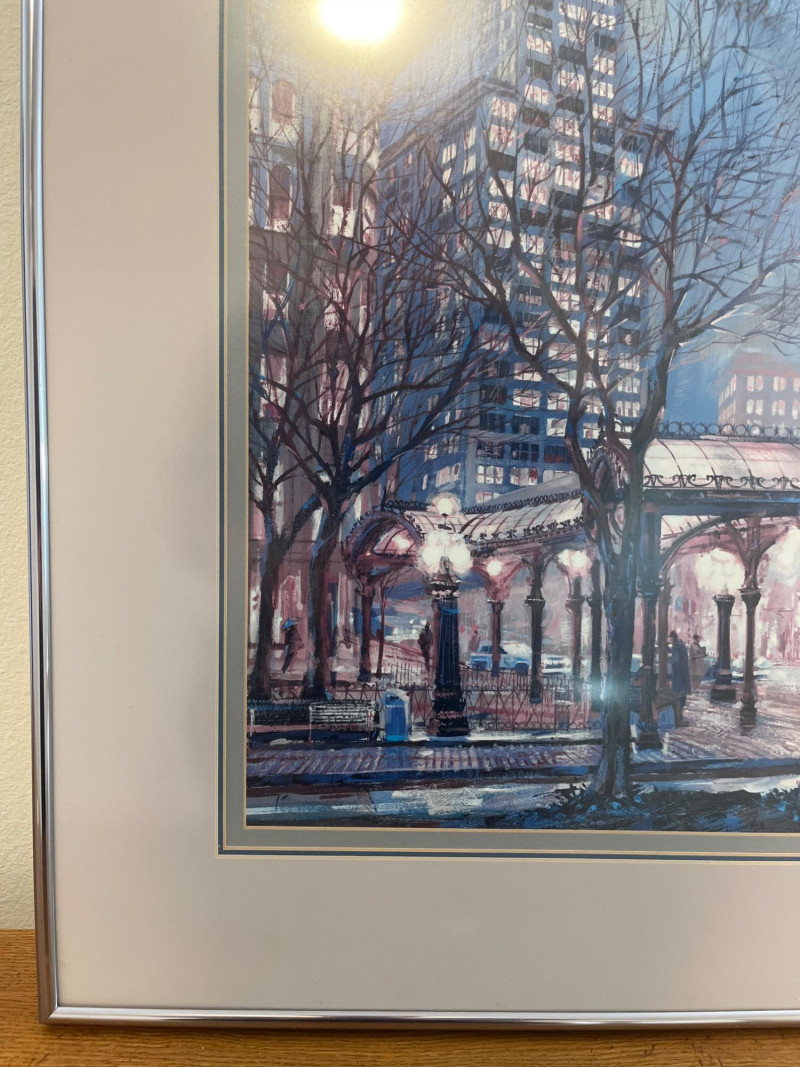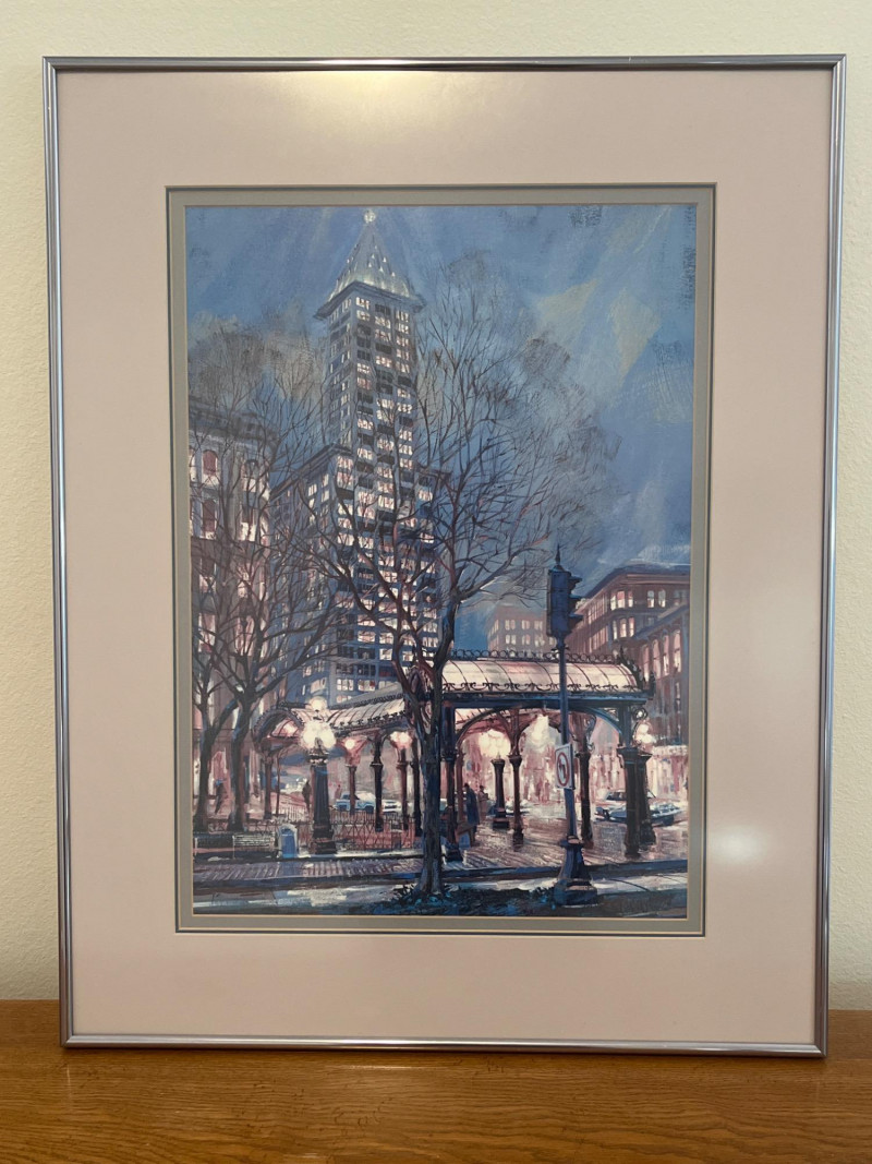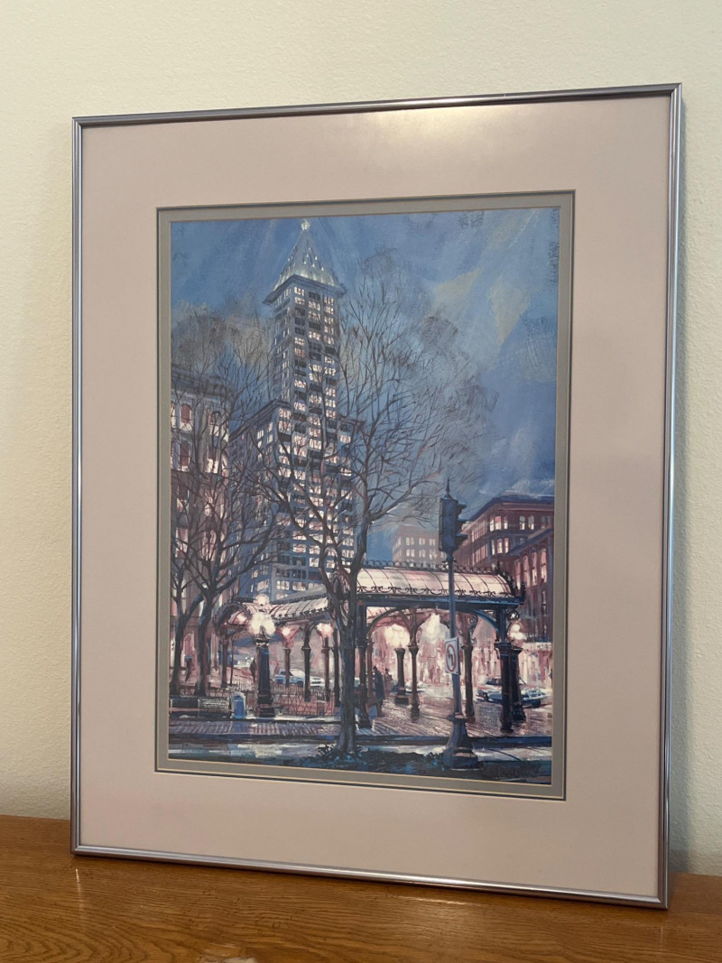 Professionally Matted & Framed Art Print of Seattle’s Pioneer Square In very nice condition and measures 28" tall and 22" wide.
