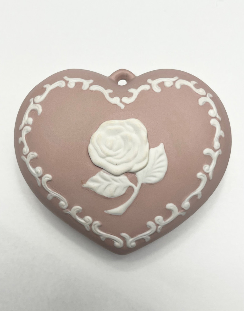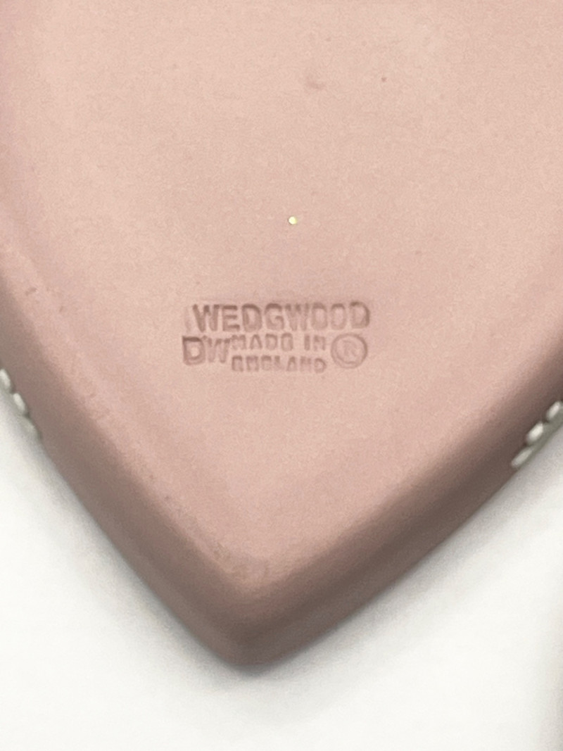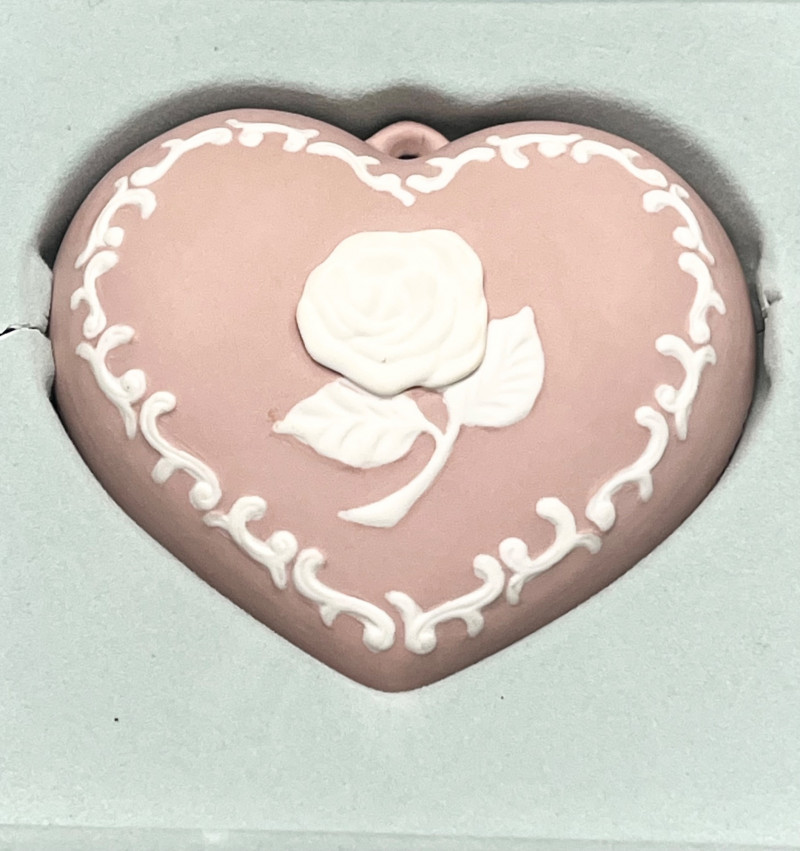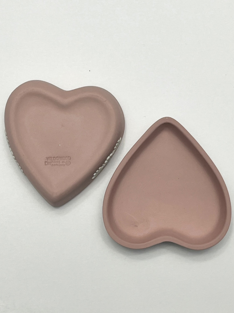 Pink Wedgwood Jasperware Heart Trinket Dish & Breast Cancer Ornament Ornament is 3" wide and the trinket dish is 2 1/2" wide. Both pieces are in very good condition with no cracks, chips or stains. The ornament comes in its original box. The box has some damage but still safely stores this little gem when not being displayed.